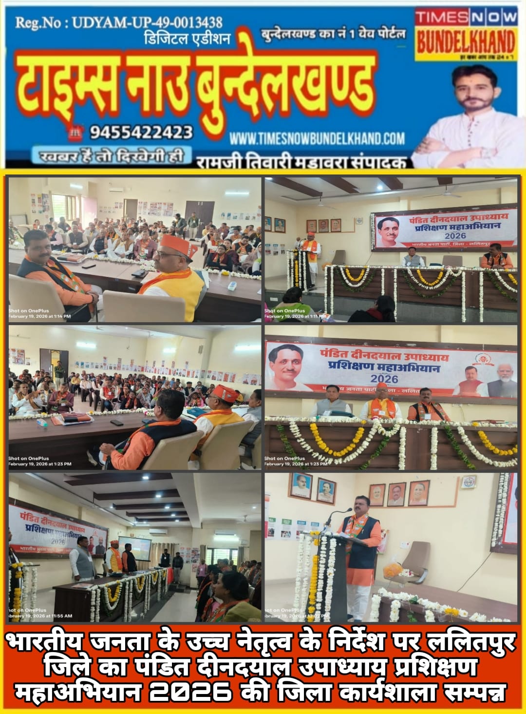 ललितपुर -आज भारतीय जनता पार्टी के जिला कार्यालय पर भारतीय जनता पार्टी के उच्च नेतृत्व के निर्देश पर पंडित दीनदयाल उपाध्याय प्रशिक्षण महाअभियान 2026 की कार्यशाला दो सत्रों में दस बजे से चार बजे तक आयोजित हुई। जिसमें प्रमुख कार्यकर्ताओं, पदाधिकारियों, जनप्रतिनिधियों को भारतीय जनता पार्टी की रीतियों, नीतियों को लेकर मुख्य अतिथि कानपुर बुन्देलखण्ड क्षेत्र के जिला महामंत्री रामकिशोर साहू द्वारा प्रशिक्षण दिया गया।