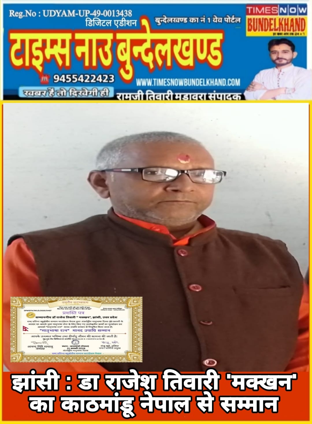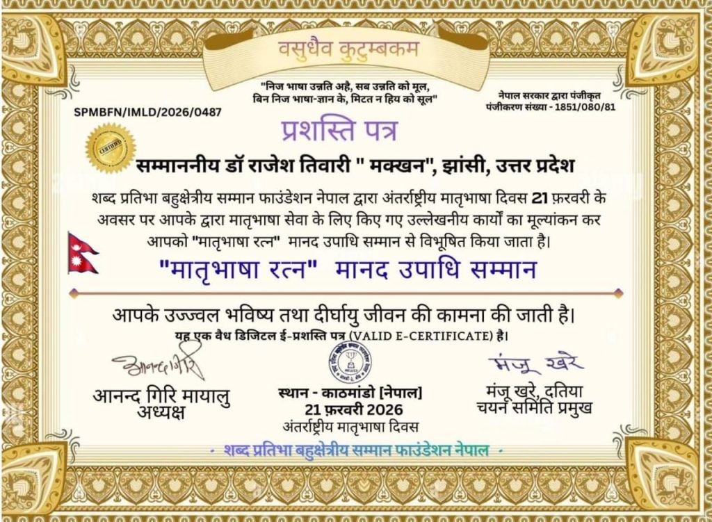 झांसी \ झांसी जिले के वरिष्ठ साहित्यकार डा राजेश तिवारी मक्खन जिला अध्यक्ष हिन्दी साहित्य भारती झांसी को शब्द प्रतिभा बहुक्षेत्रीय सम्मान फाउंडेशन नेपाल द्वारा अन्तर्राष्ट्रीय मातृभाषा दिवस पर आपके द्वारा मातृभाषा सेवा के लिए किए गए उल्लेखनीय कार्यों का मूल्यांकन कर “मातृभाषा रत्न” मानद उपाधि सम्मान से विभूषित किया गया है । यह सम्मान काठमांडू नेपाल से ‘वसुधैव कुटुम्बकम्’ नेपाल सरकार द्वारा पंजीकृत संस्था के अध्यक्ष श्री आनन्द गिरि मायालु एवं चयन समिति प्रमुख श्रीमती मंजू खरे द्वारा प्रदान किया गया है।