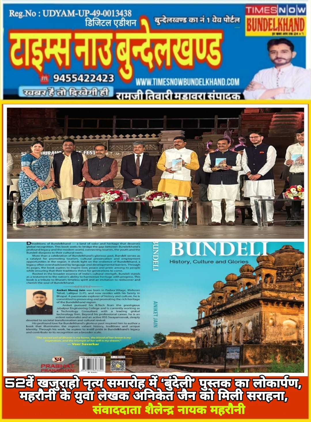 यूनेस्को विश्व धरोहर स्थल खजुराहो समूह स्मारक के प्रांगण में आयोजित 52वें खजुराहो नृत्य समारोह के अवसर पर महरौनी निवासी युवा साहित्यकार अनिकेत जैन की पुस्तक ‘बुंदेली: इतिहास, संस्कृति और गौरवगाथाएं’ का भव्य लोकार्पण किया गया। समारोह में पुस्तक को बुंदेलखंड की सांस्कृतिक धरोहर के संरक्षण की दिशा में महत्वपूर्ण पहल बताया गया।