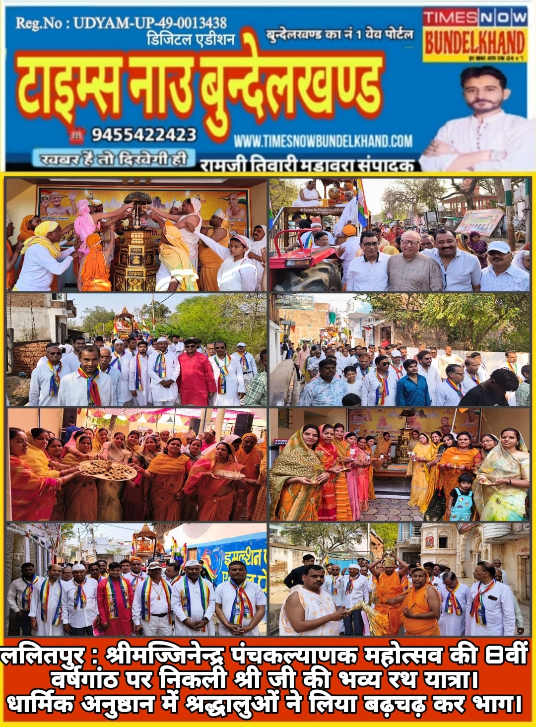 श्रीमज्जिनेन्द्र पंचकल्याणक महोत्सव की 8वीं वर्षगांठ पर निकली श्री जी की भव्य रथ यात्रा। धार्मिक अनुष्ठान में श्रद्धालुओं ने लिया बढ़चढ़ कर भाग।