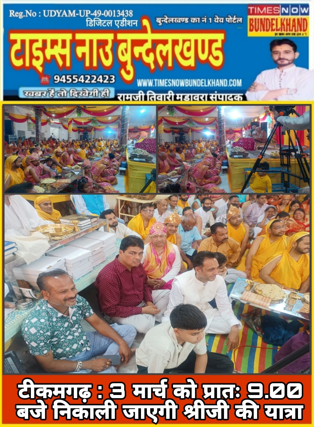 इस विधान के पूर्ण होने पर दिनांक 3 मार्च प्रातः 9.00 बजे से श्रीजी की यात्रा निकाली जाएगी जो नया मंदिर से , कटरा बाजार, जवाहर चौराहा , सिंधी धर्मशाला स्टेट बैंक चौराहा पपौरा चौराहा होती हुई नगर भवन चौराहा नया मंदिर टीकमगढ पर समापन होगा
