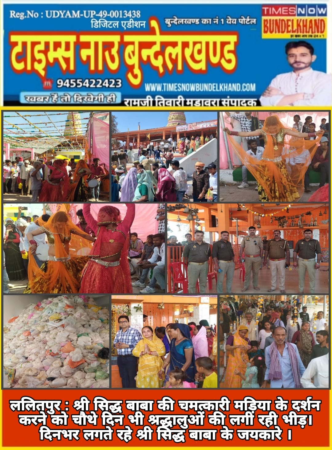 ललितपुर : विकास खण्ड जखौरा क्षेत्र अंतर्गत ग्राम राखपंचमपुर में स्थित श्री श्री 1008 श्री सिद्ध बाबा मन्दिर पर भव्य मेला का आयोजन चल रहा है राखपंचमपुर मेले का शुभारम्भ 7 मार्च को हमारे लोकप्रिय जिलाधिकारी महोदय के करकमलों से फीता काटकर शुभारम्भ किया गया था और यह मेला 11 मार्च तक चलेगा दिन बुधवार को मेले का आखिरी दिन है मेले के चौथे दिन भी श्री सिद्ध बाबा मन्दिर पर श्री सिद्ध बाबा की चमत्कारी मड़िया के दर्शन करने को श्रद्धालुओं की भाड़ी भीड़ लगी रही श्रद्धालुओं ने श्री सिद्ध बाबा की चमत्कारी मड़िया के दर्शन कर आशीर्वाद प्राप्त किया श्री सिद्ध बाबा मन्दिर से ली गई पवित्र भभूति (राख) फोड़ा फुन्सी पर लगाने से ठीक हो जाती है और भभूति राख को अपने शरीर पर लगाने से असाध्य चर्म रोग से छुटकारा मिलता है श्रद्धालुओं ‌द्वारा सीदे में आटा, दाल, चावल, आलू ,नमक, मिर्ची, तेल ,घी चढ़ाया वैज्ञानिक युग में भी श्री सिद्ध बाबा का चमत्कार अब भी बना हुआ है श्री सिद्ध बाबा मन्दिर व मेला परिसर में जगह जगह सी सी कैमरा लगे हुये है और डोन कैमरे से मेला में हो रही हर गति विधि कैद हो रही है पुलिस अधीक्षक मोहम्मद मुश्ताक की ओर से राखपंचमपुर मेला में चप्पे चप्पे पर भारी संख्या में पुलिस बल तैनात हैं जिसमें पुरुष पुलिस बल, महिला पुलिस बल,सादा वर्दी में भी पुलिस बल तैनात हैं असमाजिक तत्वों व चोरों से निपटने के लिये प्रभारी निरीक्षक जखौरा राजीव कुमार बेस,पुलिस चौकी मेला प्रभारी मूलचन्द ,उपनिरीक्षक बृजेश कुमार,हैड कांस्टेबल अरविन्द कुमार,हैड कांस्टेबल प्रेमबाबू दीवान जी, कान्स्टेबल चन्द्रकान्त शर्मा,अपने पुलिस बल के साथ मेला परिसर में भ्रमण सील रहकर व्यवस्थाओं को देखते रहे एवं असमाजिक तत्वों पर भी अपनी निगाहें टिकायें रहे मेला प्रभारी नायब तहसीलदार घनेन्द्र तिवारी भी मेला परिसर में भ्रमणशील रहकर व्यवस्थाओं का जायजा लेते रहे श्रद्धालुओं को पानी पीने के लिये हैण्ड पम्प, जल संस्थान के पानी के टैंकर, व पानी की पाइप लाइन के नल लगे हुये है मेले में आग बुझाने के लिये फायर ब्रिगेड की गाड़ी लगी हुई है मेले में अस्थाई पुलिस चौकी भी बनी हुई है जिसमें खोया पाया काउन्टर भी बना हुआ है स्वास्थ विभाग की ओर से एम्बूलैंस व निःशुल्क दवा वितरण का काउन्टर भी लगा हुआ है श्रद्धालुओं की तबियत खराब होने पर डाक्टर द्वारा निःशुल्क दवा का वितरण किया जा रहा है श्रद्धालुओं ने श्री सिद्ध बाबा मन्दिर पर पहुंचकर मन्दिर के नीचे पन्डा जी द्वारा नीम के झोरे से अपने आप को झड़वाया और श्री सिद्ध बाबा की पवित्र भभूति (राख)ग्रहण की एवं अपने शरीर पर भी लगवाई मेले में डीपी आरओ की तरफ से 50 सफाई कर्मचारी लगे हुये है जो बड़ी मेहनत से दोनों शिफ्ट में काम कर