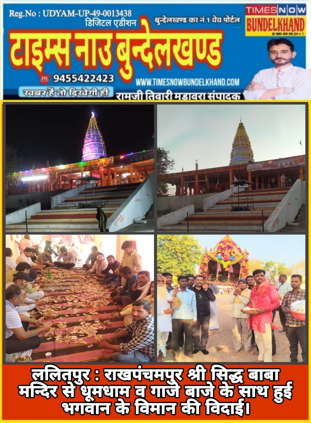 ललितपुर : विकास खण्ड जखौरा क्षेत्र अंतर्गत ग्राम राखपंचमपुर में स्थित श्री श्री 1008 श्री सिद्ध बाबा मन्दिर पर रंगपंचमी से लगने वाला विशाल मेला चल रहा था जिसमें रंगपंचमी के दिन ग्राम राखपंचमपुर में स्थित राम जानकी मन्दिर से बड़ी धूमधाम व गाजे बाजे के साथ भगवान के विमान श्री सिद्ध बाबा मन्दिर पर आये हुये थे और तीन दिन तक भगवान के विमान श्री सिद्ध बाबा मन्दिर पर रुके हुये थे दिन गुरुवार को श्री सिद्ध बाबा मन्दिर से भगवान के विमान की पंडित अशोक कुमार शर्मा ने बड़े ही विधी विधान से पूजा अर्चना की इसके बाद समस्त श्रद्धालुओं ने विमान में बैठे भगवान दर्शन किये और भगवान के समक्ष माथा टेककर भगवान का आशीर्वाद प्राप्त किया फिर राखपंचमपुर लेखपाल संजीव कुमार मिश्रा ने श्री सिद्ध बाबा मन्दिर से ढोल नगाड़ों के बीच बड़े ही धूमधाम व गाजे बाजे के साथ भगवान के विमान की विदाई की और भगवान के विमान की शोभायात्रा ग्राम राखपंचमपुर में स्थित राम जानकी मन्दिर पर पहुंचकर भगवान विराजमान हुये श्री सिद्ध बाबा मन्दिर पर श्रद्धालुओं द्वारा चढ़ाये गये रुपयों की गिनती राजस्व कर्मियों द्वारा चलती रही भगवान के विमान की विदाई पंडित अशोक कुमार शर्मा, राखपंचमपुर लेखपाल संजीव कुमार मिश्रा, ग्राम प्रधान राखपंचमपुर राजपाल सिंह यादव, देवेन्द्र राय,विक्रम पन्डा ,वीरेन्द्र पन्डा,जयराम सिंह राजपूत,रोहित सिंह ठाकुर, देवेन्द्र सिंह,अरुण कुमार, रामरतन,आदि उपस्थित रहे।