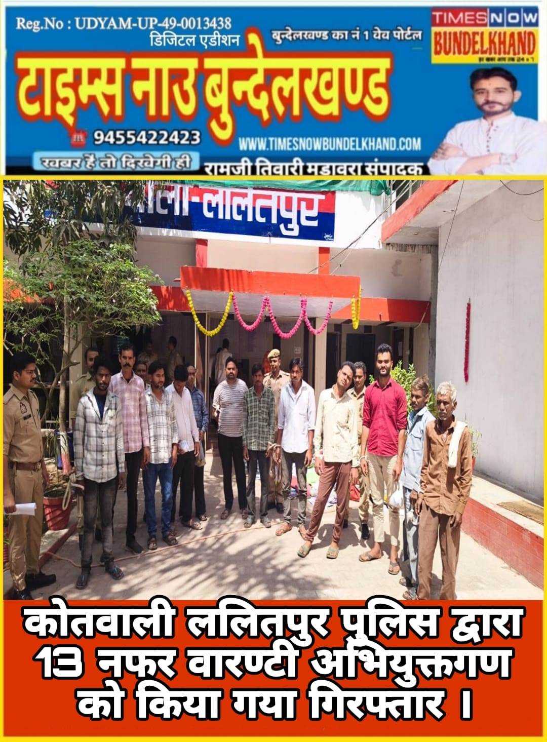 श्रीमान् पुलिस अधीक्षक ललितपुर श्री मो0 मुश्ताक के निर्देशन में एवं अपर पुलिस अधीक्षक श्री कालू सिंह एंव क्षेत्राधिकारी सदर श्री सुनील कुमार भारद्वाज के पर्यवेक्षण में, जनपद में वांछित/वारण्टी अभियुक्तगण की गिरफ्तारी हेतु चलाये जा रहे अभियान के क्रम में *कोतवाली ललितपुर पुलिस* द्वारा 13 नफर वारण्टी अभियुक्तगण को नियमानुसार गिरफ्तार कर माननीय न्यायालय के समक्ष पेश किया गया ।