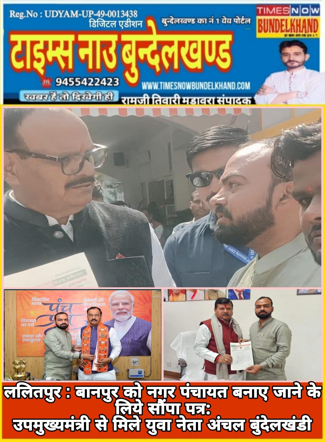 बानपुर – भारतीय जनता पार्टी के युवा नेता अंचल बुंदेलखंडी ने बानपुर को नगर पंचायत बनाने की मांग को लेकर सोमवार को लखनऊ में उत्तर प्रदेश के उपमुख्यमंत्रियों और नगर विकास मंत्री से मुलाकात की।
