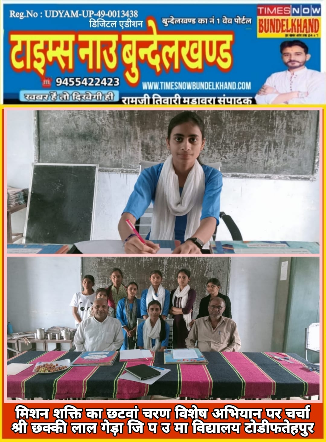 टोडी फतेहपुर/मिशन शक्ति का छटवा चरण विशेष अभियान के अंतर्गत श्री छक्की लाल गेडा जिला पंचायत उत्तर माध्यमिक विद्यालय टोडी फतेहपुर जिला झांसी में एक दिन के लिए दिनांक 19/3/2026 को कुमारी शुभी जैन को प्रधानाचार्य बनाया गया। द्वितीय दिवस में मिशन शक्ति मंच की बैठक का आयोजन किया गया। जिसमें स्वास्थ्य चिकित्सा सेवा महिला स्वास्थ्य पर चर्चा हुई एवं शासन द्वारा निर्धारित योजनाओं की जानकारी दी गई । मुख्यमंत्री कन्या सुमंगला योजना , निराश्रित महिला पेंशन योजना , बेटी बचाओ बेटी पढ़ाओ योजना, आपातकालीन सहायता हेतु चाइल्ड हेल्पलाइन 1098 महिला हेल्पलाइन 181\ 1090 पुलिस कंट्रोल रूम 112 एंबुलेंस 108 आदि पर विस्तृत चर्चा कर सभी को जानकारी दी गई इस अवसर पर इंचार्ज प्रधानाचार्य श्री राजेश तिवारी सहायक अध्यापक श्री शशिकांत वाजपेई शुभी जैन ,चांदनी बानो ,नेहा, सुहानी ,एकता ,साक्षी, खुशनुमा, खुशी ,प्राची, निधि, वैशाली ,छवि राजा आदि छात्राएं उपस्थित रही ।