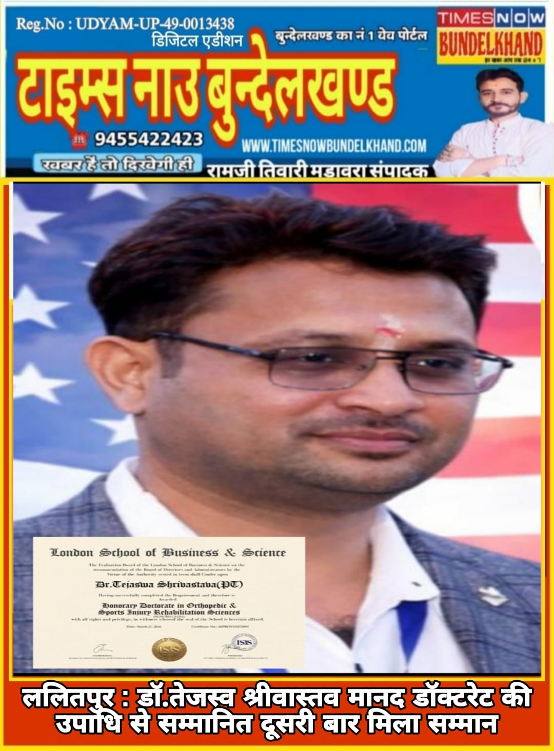 ललितपुर : डॉ.तेजस्व श्रीवास्तव जो की हाल ही में उत्तर प्रदेश शासन द्वारा नगर पालिका परिषद ललितपुर के मनोनीत पार्षद नियुक्त हुए हैं उन्हें पुनः मानद डॉक्टरेट की उपाधि से सम्मानित किया गया है इस बार यह सम्मान उनको इंग्लैंड स्थित लंदन स्कूल ऑफ बिजनेस एंड साइंसेज ने ऑर्थोपेडिक एंड स्पोर्ट्स इंजरी रिहैबिलिटेशन साइंसेज में ऑनलाइन दीक्षांत समारोह के माध्यम से जिसमें उनके साथ भारत स्विट्जरलैंड यूके यूएसए सऊदी अरब और मिडिल ईस्ट एवं दुबई के व्यक्तियों जिन्होंने अपने-अपने क्षेत्र में उत्कृष्ट योगदान दिया है उनके साथ दिया गया है