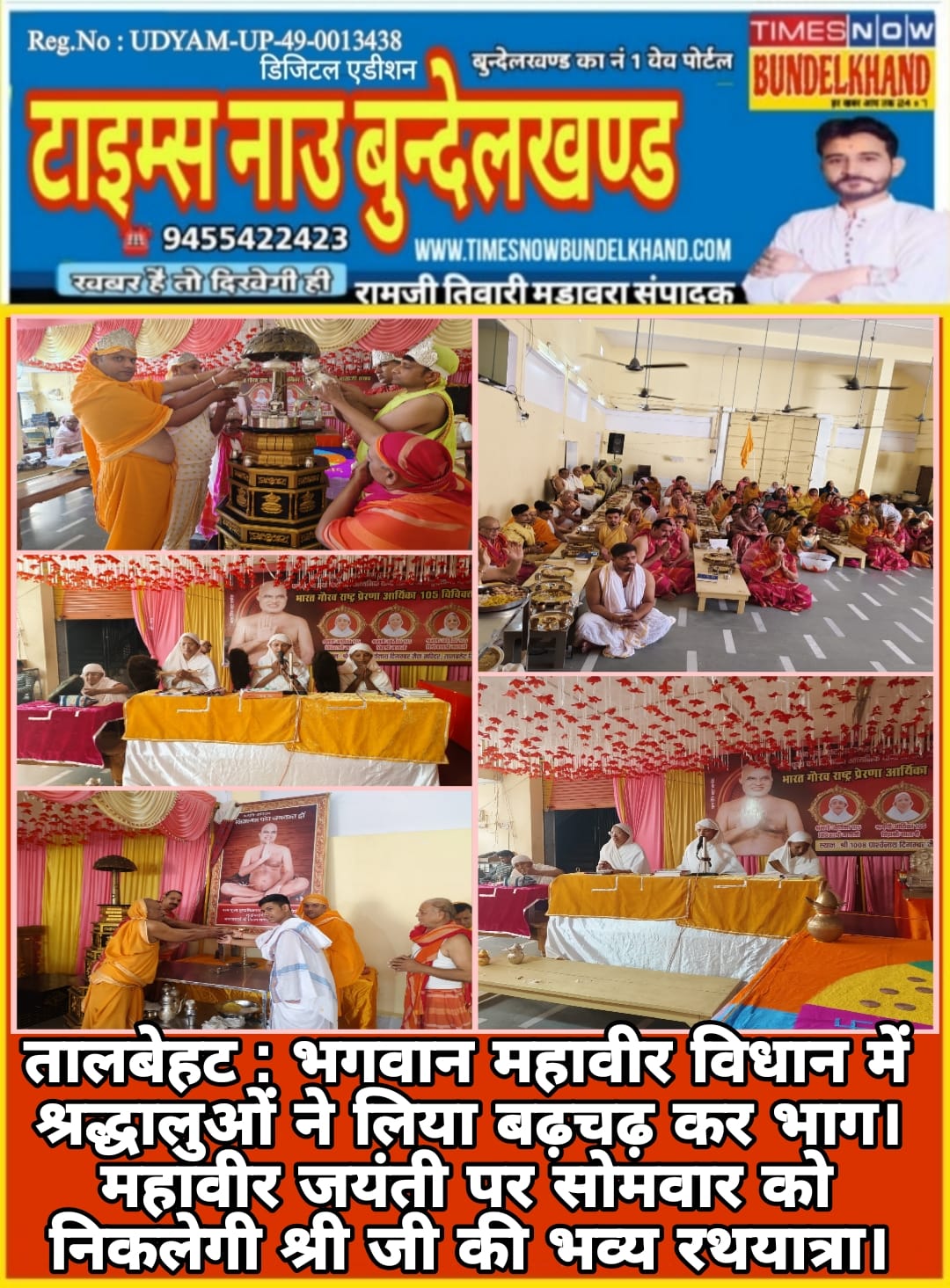 तालबेहट(ललितपुर) नगर के पारसनाथ दिगम्बर जैन मंदिर में भगवान महावीर स्वामी के जन्मकल्याणक से पूर्व पूज्य श्रमणी आर्यिका 105 विविक्त श्री माता जी के ससंघ मंगलमय सानिध्य में रविवार को पं. संतोष कुमार शास्त्री अमृत के नेतृत्व में सुबह अभिषेक शांतिधारा एवं ध्वजारोहण के बाद भगवान महावीर विधान का आयोजन किया गया। जिसमें श्रद्धालुओं ने बढ़चढ़ कर भाग लिया। पूज्य श्रमणी आर्यिका विविक्त श्री माताजी ने मंगल प्रवचन में धर्म का मर्म समझाते हुए वर्तमान शासन नायक जैन धर्म के 24वें तीर्थंकर भगवान महावीर स्वामी की जयंती धूमधाम के साथ धर्म प्रभावना करते हुए भव्यता से मनाने का आह्वान किया। रात्रि में महाआरती के बाद भव्य सांस्कृतिक कार्यक्रम एवं तीर्थंकर माता के 16 स्वप्न पर सुन्दर नाटिका प्रस्तुत की गयी। कार्यक्रम में सकल दिगम्बर जैन समाज का सक्रिय सहयोग रहा। मंदिर समिति के पदाधिकारियों ने बताया कि दिनांक 30/03/2026 दिन सोमवार सुबह बुंदेलखंड के प्रथम गणाचार्य विराग सागर महाराज की परम् प्रभावी शिष्या भारत गौरव विविक्त श्री माताजी, विप्रा श्री माता जी, वियोजना श्री माता जी, विशुद्रण श्री माताजी के ससंघ मंगलमय सानिध्य में अभिषेक शांतिधारा पूजन विधाएवं प्रभात फेरी के बाद पूज्य श्रमणी आर्यिका के मंगल प्रवचन एवं आहारचार्य संपन्न होगी। दोपहर 1 बजे श्री जी की भव्य रथ यात्रा एवं पाठशाला के बच्चों द्वारा भव्य झांकी निकाली जाएगी, सायं 4 बजे वार्षिक कलशाभिषेक फूलमाल एवं पूज्य श्रमणी आर्यिका के मांगलिक प्रवचन होंगे। रात्रि में महाआरती एवं भगवान महावीर स्वामी का पालन कार्यक्रम होगा।