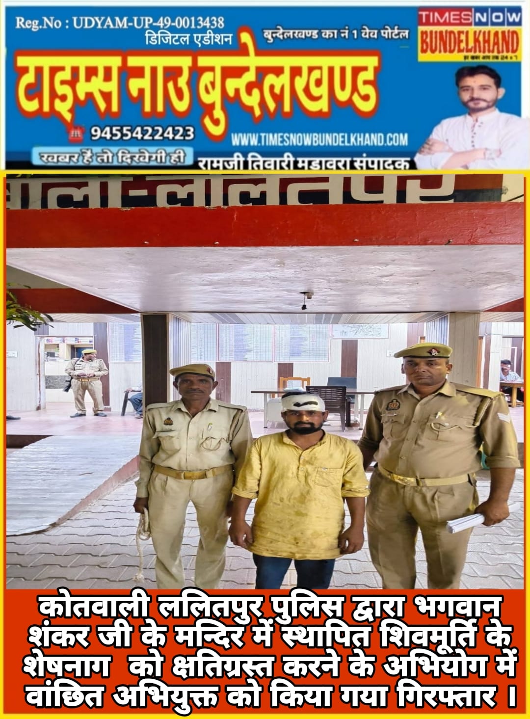 *कोतवाली ललितपुर पुलिस द्वारा भगवान शंकर जी के मन्दिर में स्थापित शिवमूर्ति के शेषनाग को क्षतिग्रस्त करने के अभियोग में वांछित अभियुक्त को किया गया गिरफ्तार ।*