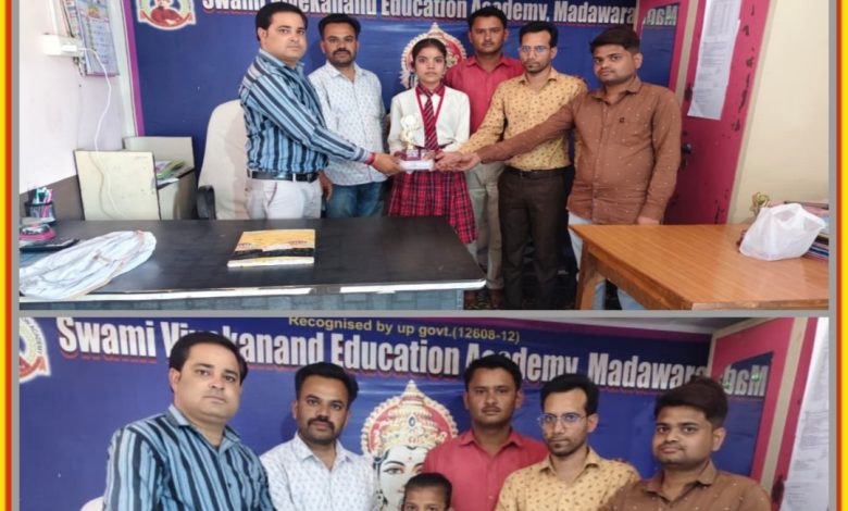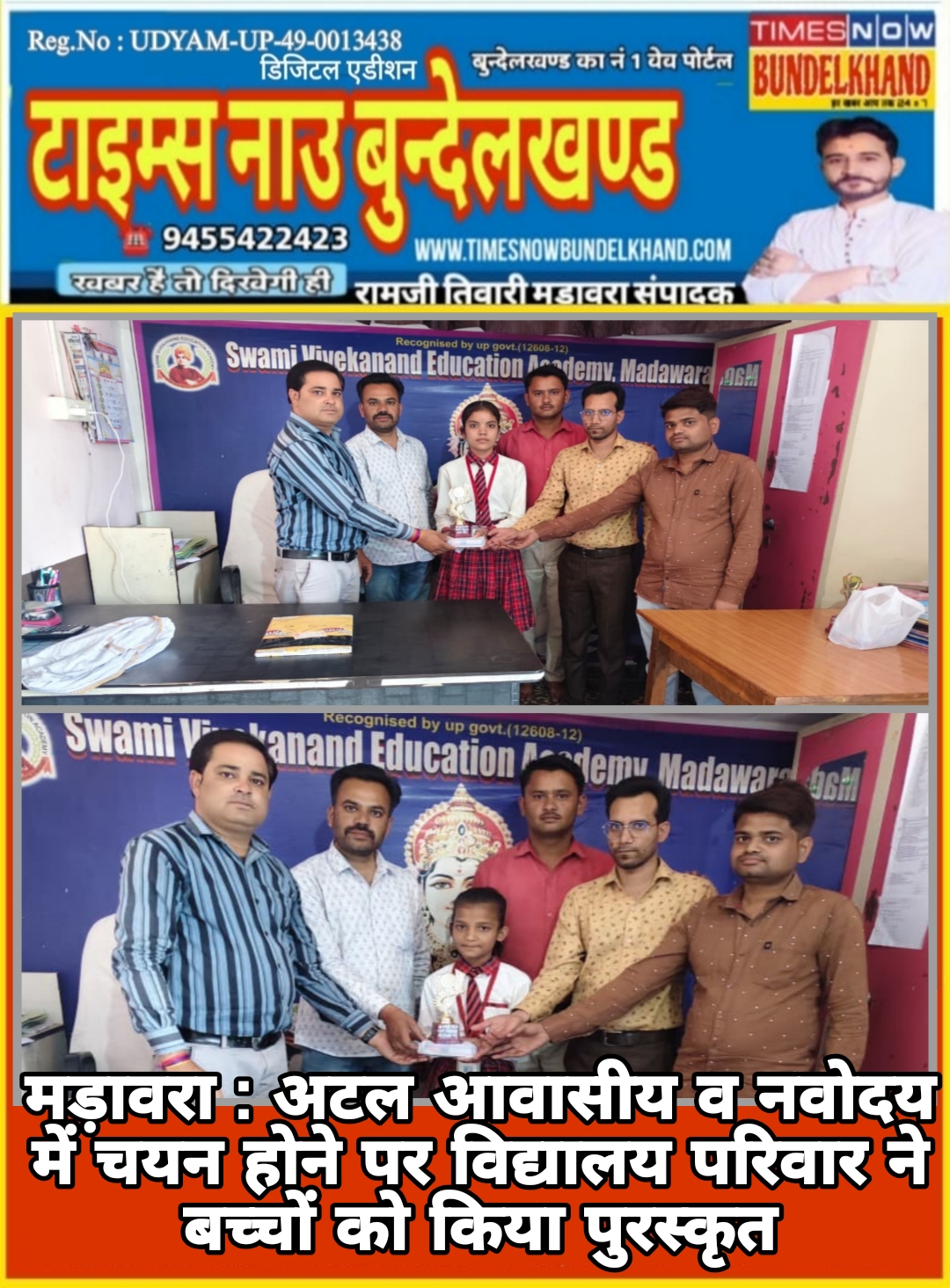मड़ावरा : कस्बा मड़ावरा के स्वामी विवेकानंद एजुकेशन एकेडमी की कक्षा 8 की छात्रा आकांक्षा साहू का अटल आवासीय विद्यालय में कक्षा 9 में व प्रगती का नवोदय विद्यालय दैलवारा में कक्षा 6 में चयन होने पर विद्यालय परिवार द्वारा पुरस्कृत किया गया है इस मौके पर स्कूल प्रबंधक मुकुंद प्रताप सिंह, उदय प्रताप सिंह, प्रिंसिपल छत्रसाल सिंह, अध्यापक रूप सिंह सर ,शुभम सर, प्रिंस सर, व समस्त स्टाफ द्वारा बच्चों को उज्जवल भविष्य की शुभकामनाएं प्रेषित की गई है