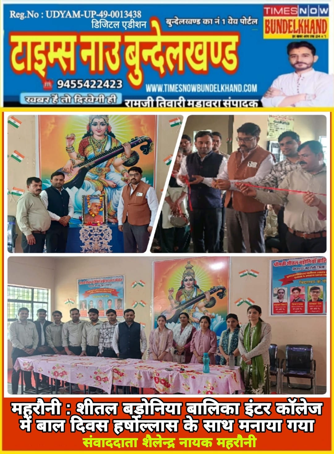 नगर के ललितपुर रोड स्थित श्रीमती शीतल बड़ोनिया बालिका इंटर कॉलेज में बाल दिवस उत्साहपूर्वक मनाया गया। कार्यक्रम का शुभारंभ प्रबंधक दुष्यंत बड़ोनिया, प्रधानाचार्य दुष्यंत नायक एवं प्रभारी रवि खरे द्वारा मां सरस्वती एवं पंडित जवाहरलाल नेहरू के चित्र पर पुष्पार्चन व दीप प्रज्वलन से हुआ। कार्यक्रम में स्व. रविंद्रानंद बड़ोनिया महाविद्यालय से आए अध्यापकगण मुख्य अतिथि रहे।