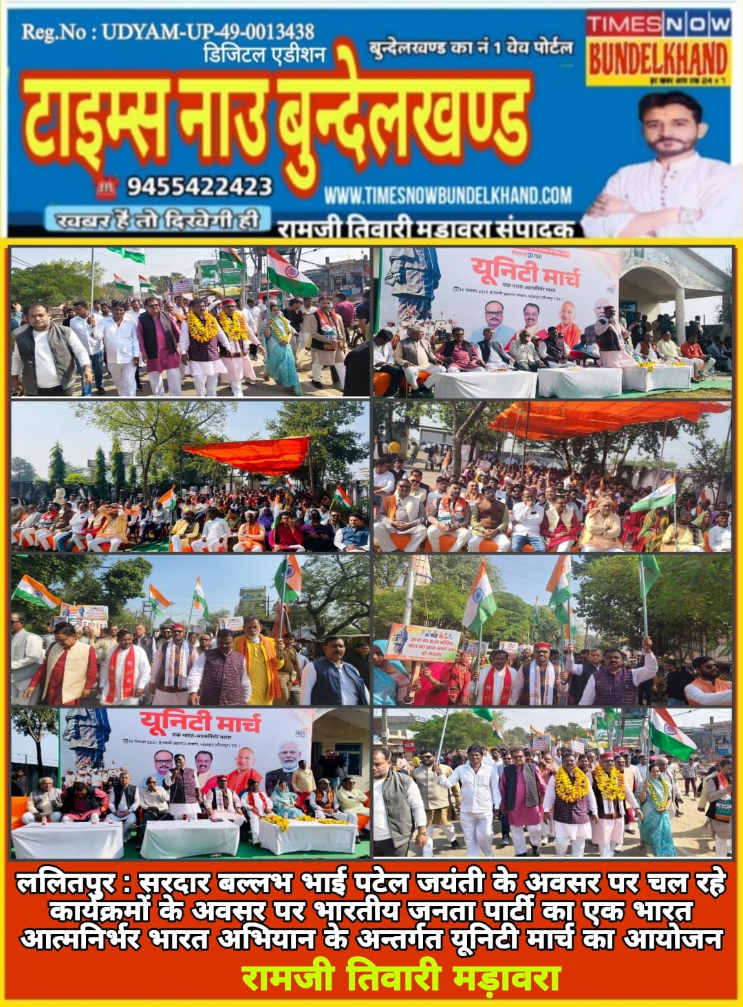 ललितपुर : भारतीय जनता पार्टी के उच्च नेतृत्व के निर्देश पर सरदार बल्लभ भाई पटेल जी की एक सौ पचासवीं जयंती के अवसर पर चल रहे एक भारत आत्मनिर्भर भारत अभियान के अन्तर्गत आज यूनिटी मार्च पद यात्रा का आयोजन किया गया।यह आयोजन तुवन मंदिर से लेकर स्वामी ब्रह्मानंद संस्थान महेशपुरा तक यूनिटी मार्च के रूप में हुआ। मार्च में पदयात्री हाथों में आत्मनिर्भर सम्बन्धित वैनर, पोस्टर,दफ्ती लिए हुए नारेबाजी करते हुए चल रहे थे ।