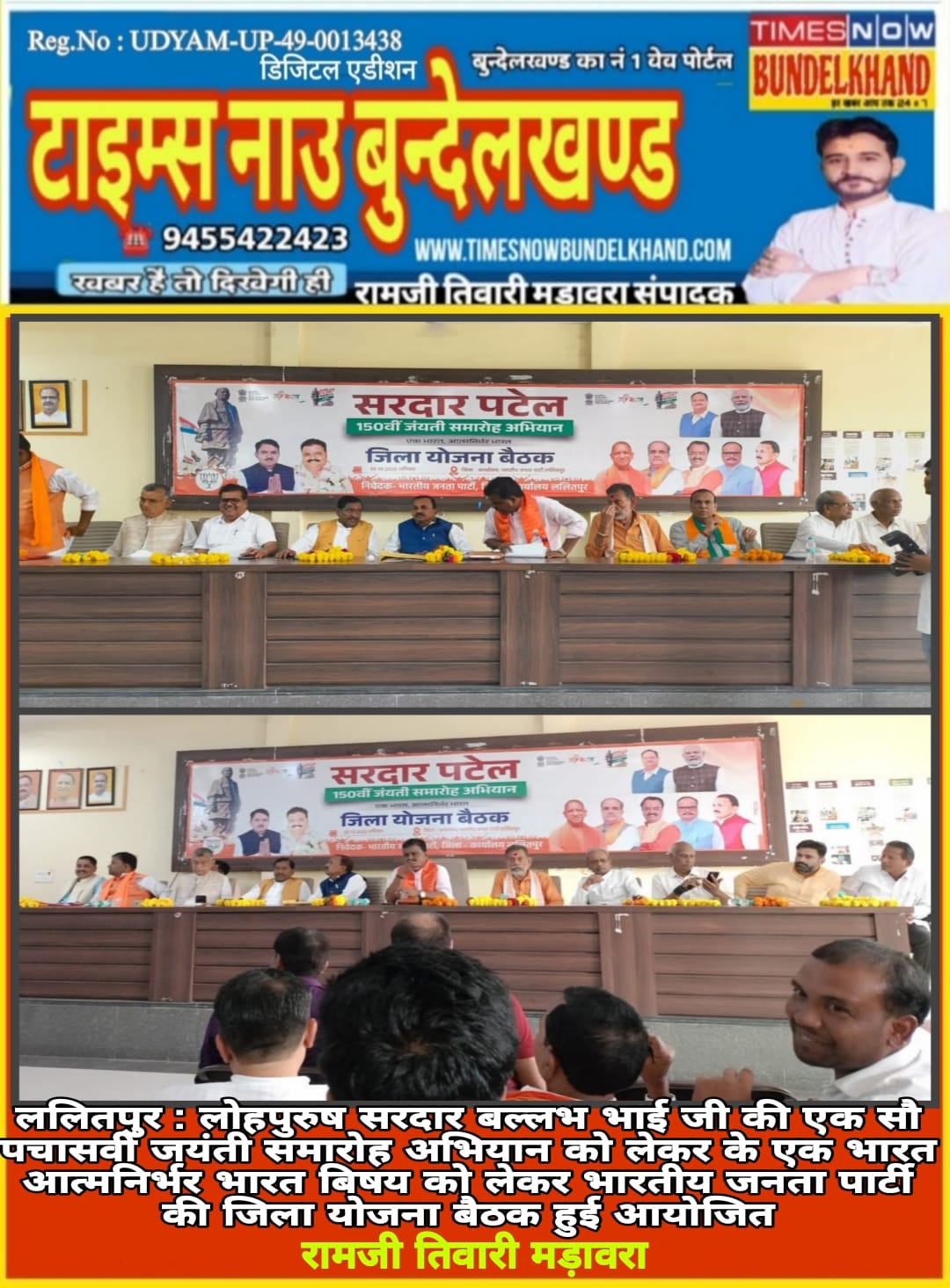 -ललितपुर- भारतीय जनता पार्टी की ललितपुर इकाई ने उच्च नेतृत्व के निर्देश पर चल रहे लोह पुरुष सरदार पटेल जी की एक सौ पचासवीं जयंती समारोह अभियान एक भारत आत्मनिर्भर भारत बिषय को लेकर जिला योजना बैठक का आयोजन किया गया। कार्यक्रम में मुख्य अतिथि के रूप में उपभोक्ता संघ के अध्यक्ष और दर्जा प्राप्त राज्यमंत्री मा जमुना प्रसाद कुशवाहा उपस्थित रहे।