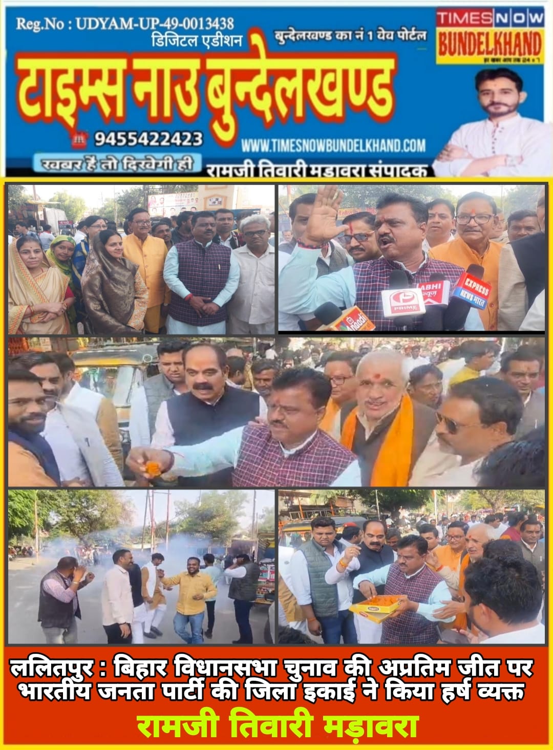 ललितपुर -बिहार विधानसभा में एन डी ए की असाधारण अभूतपूर्व जीत पर आज भारतीय जनता पार्टी की ललितपुर इकाई ने तुवन चौराहे पर जिला अध्यक्ष हरिश्चंद्र रावत के नेतृत्व में जश्न मनाया।जश्न के दौरान कार्यकर्ताओं ने आकाश को गुंजित करने बाली नारेबाजी की ।इस अवसर पर खुब आतिशबाजी की गई और‌ मिष्ठान बांट कर एक दूसरे को बधाई दी गई।इस अवसर पर जिला अध्यक्ष हरिश्चंद्र रावत ने कहा कि भारतीय जनता पार्टी की बिहार की जीत हमारे कार्यकर्ताओं की लगन, साहस, रणनीतिक कौशल,और पार्टी के प्रति ध्येय निष्ठा पर विश्वास की जीत है। उन्होंने कहा कि हम लोग अपने प्रदेश नेतृत्व के निर्देश पर समाज के विभिन्न वर्गों में काम कर रहें हैं।जिला अध्यक्ष हरिश्चंद्र रावत ने कहा कि भारतीय जनता पार्टी का अगला मिशन उत्तर प्रदेश में प्रचंड बहुमत से सरकार बनवाने का है और उत्तर प्रदेश में बहुमत से दो हजार सत्ताईस में भारतीय जनता पार्टी की सरकार वनने जा रही है ।