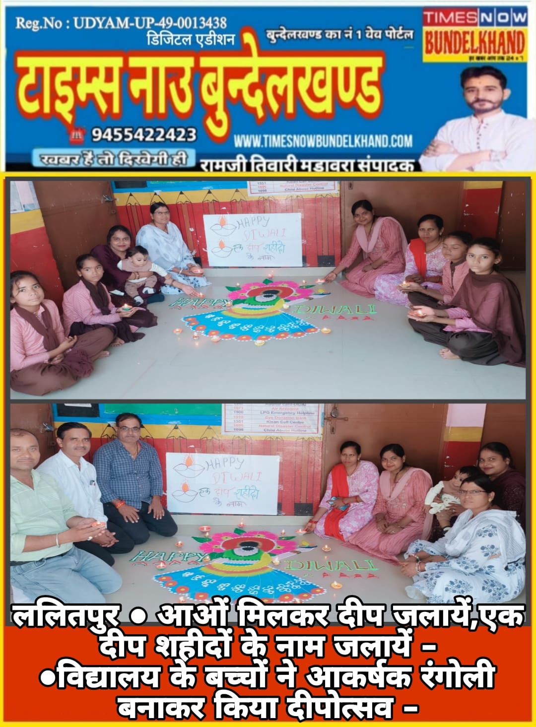 (ललितपुर) दीपोत्सव के महापर्व पर कम्पोजिट उच्च प्राथमिक विद्यालय डुलावन में दीपक सजाओं एवं रंगोली प्रतियोगिता का आयोजन कला अनुदेशक यशोदा एवं शिक्षामित्र सुनीता
