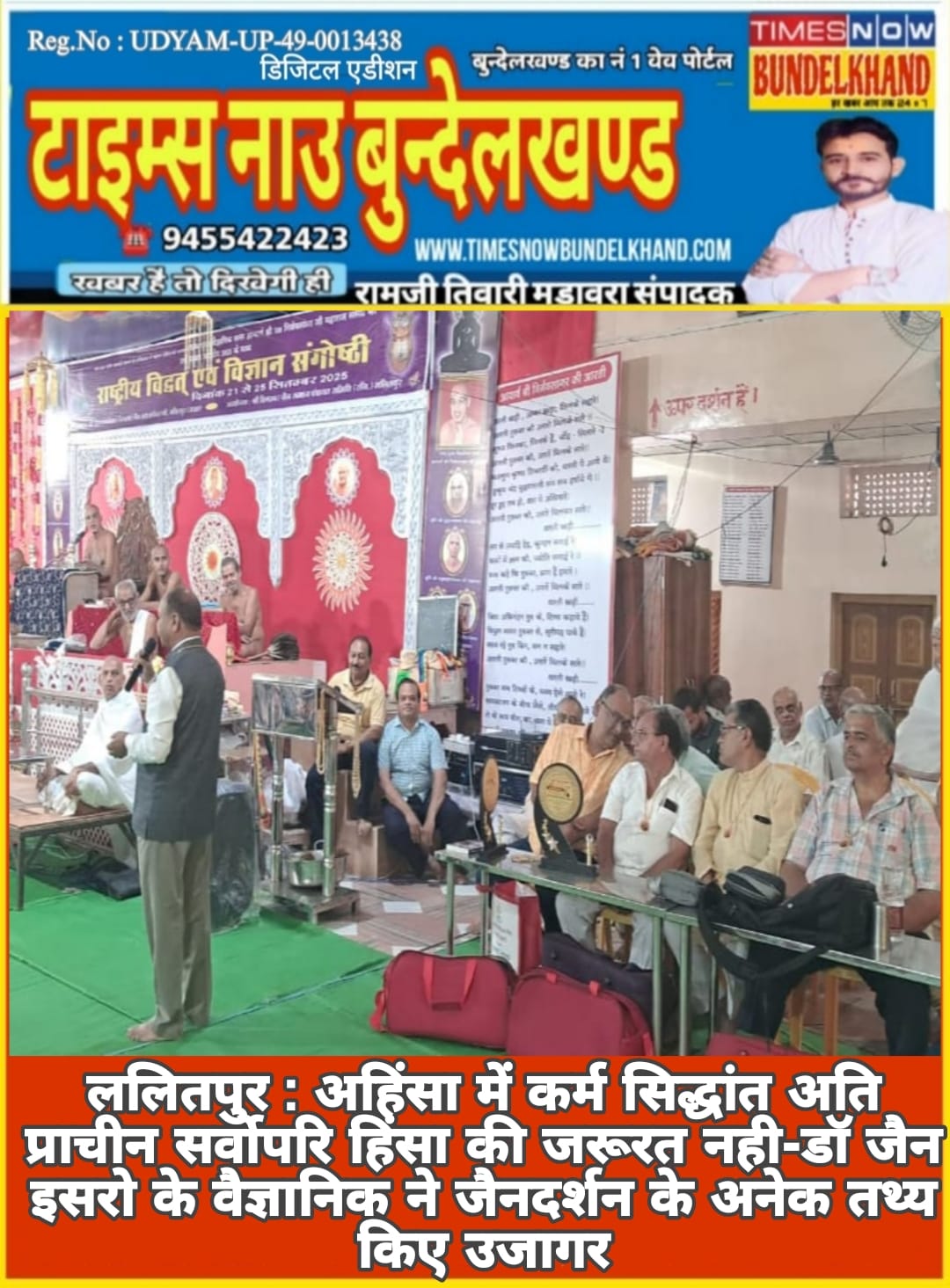 ललितपुर। वैज्ञानिक संत आचार्य निर्भय सागर महाराज के ससंघ में “विज्ञान संगोष्ठी” को सम्बोधित करते हुए इसरो के प्रख्यात वैज्ञानिक डॉ राजमल जैन ने कहा कि अहिंसा में कर्म सिद्धांत अति प्राचीन सर्वोपरि हिंसा की जरूरत नही। उन्होने अनेक देशों में भृमण के दौरान देखा विदेशों में श्रमण संस्क्रति के प्रमाण आज भी उपलब्ध हैं, जिनमें जैन धर्मग्रंथों के संदर्भ स्पष्ट रूप से अंकित हैं। इन प्रमाणों से यह सिद्ध होता है कि जैन धर्म केवल आस्था का नहीं, बल्कि वैज्ञानिक दृष्टिकोण का भी प्राचीन धर्म है। उन्होंने जैन धर्म के मूल सिद्धांत अहिंसा के वैज्ञानिक स्वरूप को दर्शाया और परस्पहरोह जीवानाम को जैन दर्शन का प्रमुख सूत्र बताया।