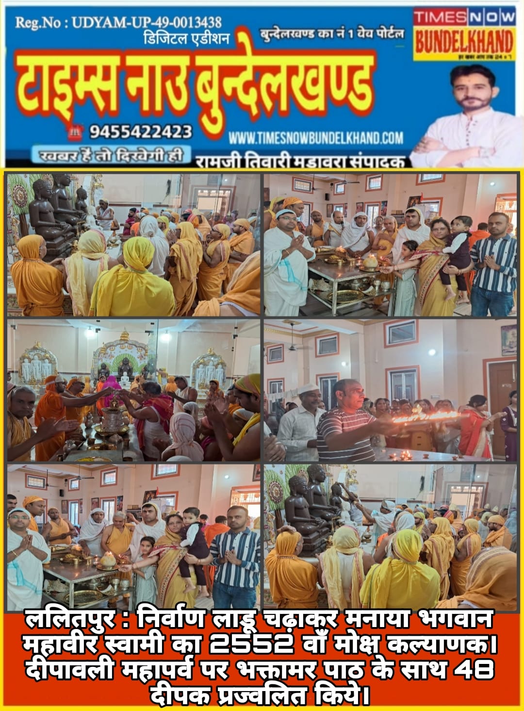 तालबेहट (ललितपुर) सिद्ध क्षेत्र पावागिरि सहित कसबे के दोनों जैन मंदिरों में निर्वाण लाडू चढ़ाकर भगवान महावीर स्वामी का 2552 वाँ मोक्ष कल्याणक एवं गौतम गणधर स्वामी का केवल्यज्ञान महोत्सव मनाया । मंगलवार को सुबह से भारी संख्या में श्रद्धालु केसरिया-पीले वस्त्र धारण कर हाथों में दीपक और अष्ट-द्रव्य लेकर मंदिर जी पहुँचे भगवान महावीर स्वामी का महा मस्तिकाभषेक किया एवं विश्व शांति की मंगल भावना के साथ मंत्रोच्चार के मध्य शांतिधारा संपन्न की। तत्पश्चात महावीर भगवान की विशेष पूजन अर्चना के साथ विधि विधान से निर्वाण लाडू समर्पित किये। दीपावली के अवसर पर सोमवार को वासुपूज्य दिगम्बर जैन मंदिर में भारतीय जैन मिलन बहु मण्डल एवं वासुपूज्य जिनालय शाखा के संयुक्त तत्वावधान में भक्तामर पाठ के साथ 48 दीपक प्रज्वलित कर महाआरती का आयोजन किया गया। इस मौक़े पर वक्ताओं ने वर्तमान शासन नायक भगवान महावीर स्वामी के आदर्श जीवन चारित्र पर प्रकाश डालते हुए उनके द्वारा बताये गए सत्य, अहिंसा, अचौर्य, अपरिग्रह, ब्रह्मचर्य और अनेकान्तवाद के मार्ग पर चलने का आह्वान किया। भारतीय जैन मिलन के अध्यक्ष विशाल जैन पवा ने कहा बाल ब्रह्मचारी बालक वर्द्धमान का जन्म 599 ई. पूर्व राजा सिद्धार्थ-त्रिशला देवी के घर बिहार के कुण्डग्राम में हुआ था एवं 72 वर्ष की आयु में 527 ई. पूर्व पावापुरी से निर्वाण पद को प्राप्त किया एवं भगवान महावीर स्वामी बन गये। कार्यक्रम में सकल दिगम्बर जैन समाज का सक्रिय सहयोग रहा। संचालन ज्ञानचंद बबीना एवं अनिल जैन ने किया। आभार व्यक्त अरुण मोदी एवं पुष्पेंद्र जैन ने किया।
