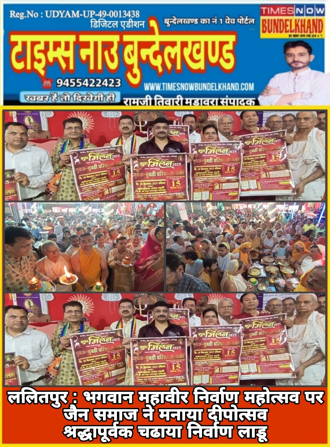 ललितपुर। भगवान महावीर स्वामी के 2552 वॉ निर्वाण महोत्सव जैन समाज ने वैज्ञानिक संत आचार्य श्री निर्भयसागर महाराज के ससंघ सानिध्य में प्रभावना पूर्वक मनाया। प्रातःकाल जैन मंदिरों में प्रभु अभिषेक शान्तिधारा के उपरान्त निर्वाण लाडू चढाया सायंकाल पूजन अर्चन के उपरान्त अपने घरों में दीपोत्सव मनाया।