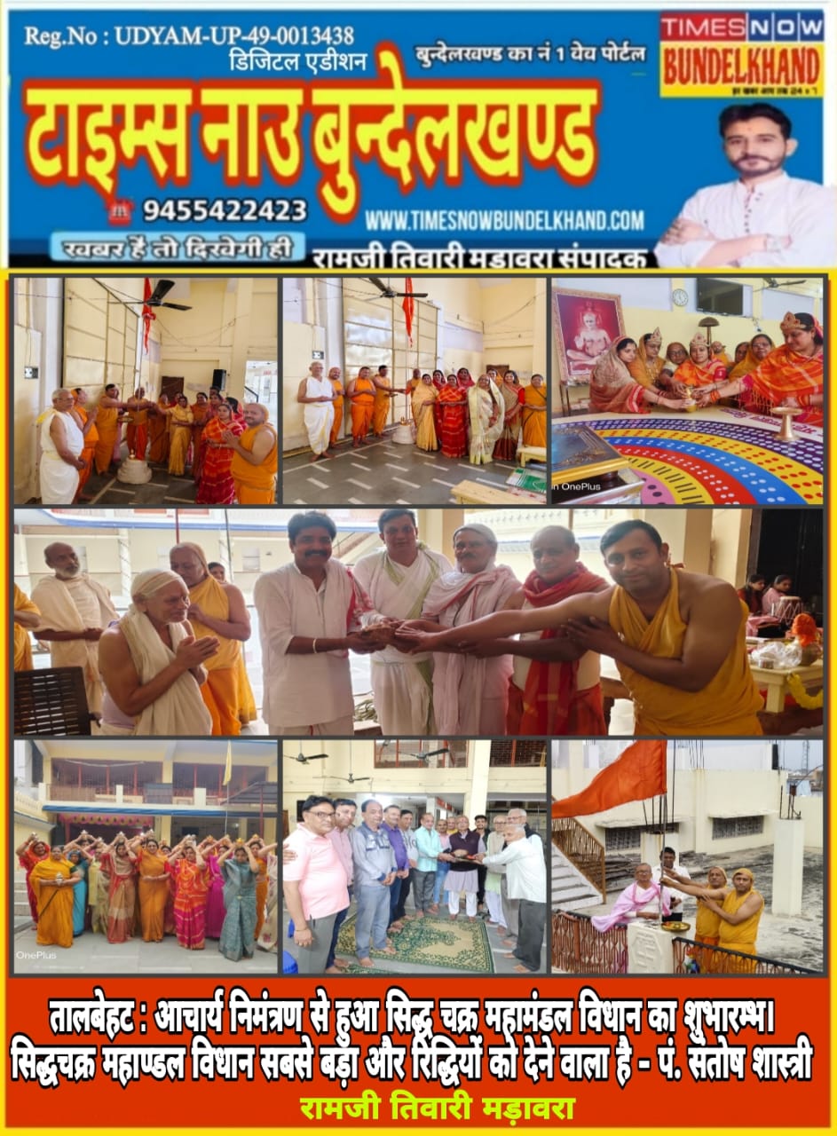 तालबेहट (ललितपुर) कसबे के पारसनाथ दिगम्बर जैन मंदिर में अष्टाह्निका महापर्व में 29 अक्टूबर से 6 नवंबर तक चलने वाले सिद्ध चक्र महामंडल विधान का शुभारम्भ मंगलवार को सायं काल की बेला में आचार्य निमंत्रण से किया गया। बुधवार को सुबह पं. संतोष कुमार जैन शास्त्री अमृत के निर्देशन में मंगलाष्टक, देवाज्ञा, नित्यमय अभिषेक शांतिधारा के उपरांत पात्र चयन, मंगल घटयात्रा, मंडप शुद्धि, ध्वजारोहण, जाप्यानुष्ठान, सकलीकरण, इंद्र प्रतिष्ठा, के बाद पूजन विधान का आयोजन किया गया। जिसमें ध्वजारोहण कर्ता प्रकाश चंद्र प्रिंस जैन पारौन, सौधर्म इंद्र चौधरी अभय कुमार राज जैन, श्रीपाल मैनासुंदरी मोदी देवेंद्र कुमार गौरव जैन बसार, कुबेर इंद्र मिठया यशपाल जैन, महायज्ञनायक चौधरी सुमत प्रकाश जैन, ईशान इंद्र रोहित बुखारिया, लौकांतिक इंद्र अनुज जैन सिटिल, सिद्धार्थ जैन, हर्ष जैन, आयुष जैन, संस्कार जैन आदि ने प्रमुख भूमिका निभाई। पं. संतोष कुमार शास्त्री ने कहा यह महाण्डल विधान सबसे बड़ा और रिद्धियों को देने वाला है अतः इसे पूर्ण विशुद्धि के साथ करना चाहिए। इस मौके पर पं. विजय कृष्ण, सुकमाल जैन, अनिल चौधरी, विनोद जैन, अरुण मोदी, कमलेश सिर्सी, अजय जैन अज्जू, विशाल जैन पवा, सौरभ मोदी, सुधीर चौधरी, आनंद जैन, तातू जैन, आदेश मोदी, मिलनराज, चक्रेश जैन, राकेश सतभैया, प्रकाश चंद परिधान, सौरभ पवैया, अमन मोदी, मुकुल जैन, विशाल चौधरी, सहित सकल दिगम्बर जैन समाज का सक्रिय सहयोग रहा।