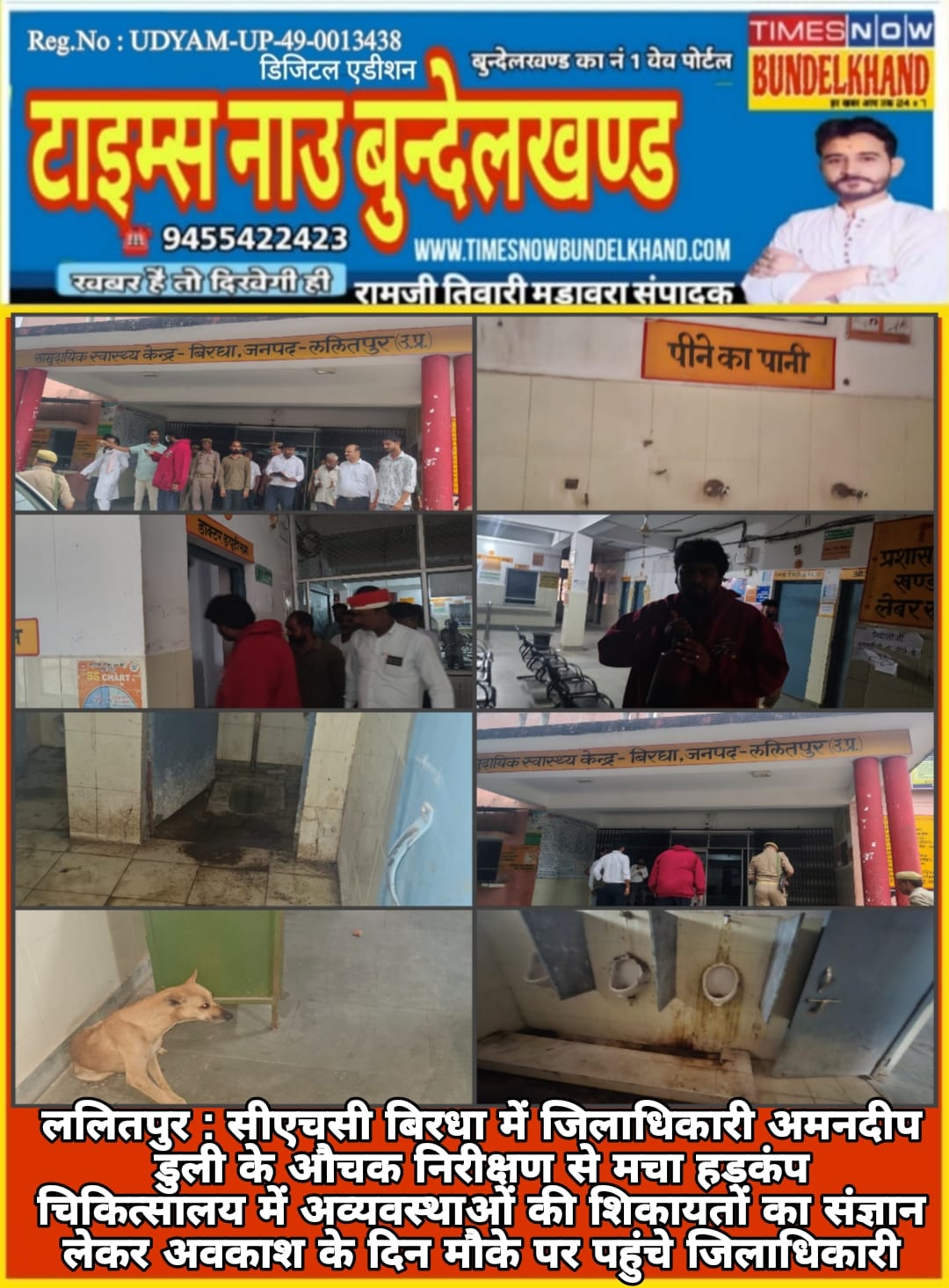 ललितपुर। विगत कई दिनों से सामुदायिक स्वास्थ्य केंद्र बिरधा में अव्यवस्थाओं की शिकायतें विभिन्न माध्यमों से प्राप्त हो रही थीं, जिनका संज्ञान लेते हुए जिला मजिस्ट्रेट श्री अमनदीप डुली ने उप जिला मजिस्ट्रेट ललितपुर मनीष कुमार के साथ रविवार को सायं 4:30 बजे सामुदायिक स्वास्थ्य केंद्र बिरधा का औचक निरीक्षण किया, निरीक्षण के दौरान चिकित्सालय में काफी अनियमितताएं पाई गई, जिस पर संबंधित चिकित्सकों को कड़ी फटकार लगाते हुए आज ही कमियां दूर कराकर अवगत कराने के निर्देश दिए गए, साथ ही उप जिला मजिस्ट्रेट को साप्ताहिक तौर पर चिकित्सालय का पर्यवेक्षण कराकर रिपोर्ट उपलब्ध कराने के निर्देश भी दिए गए।