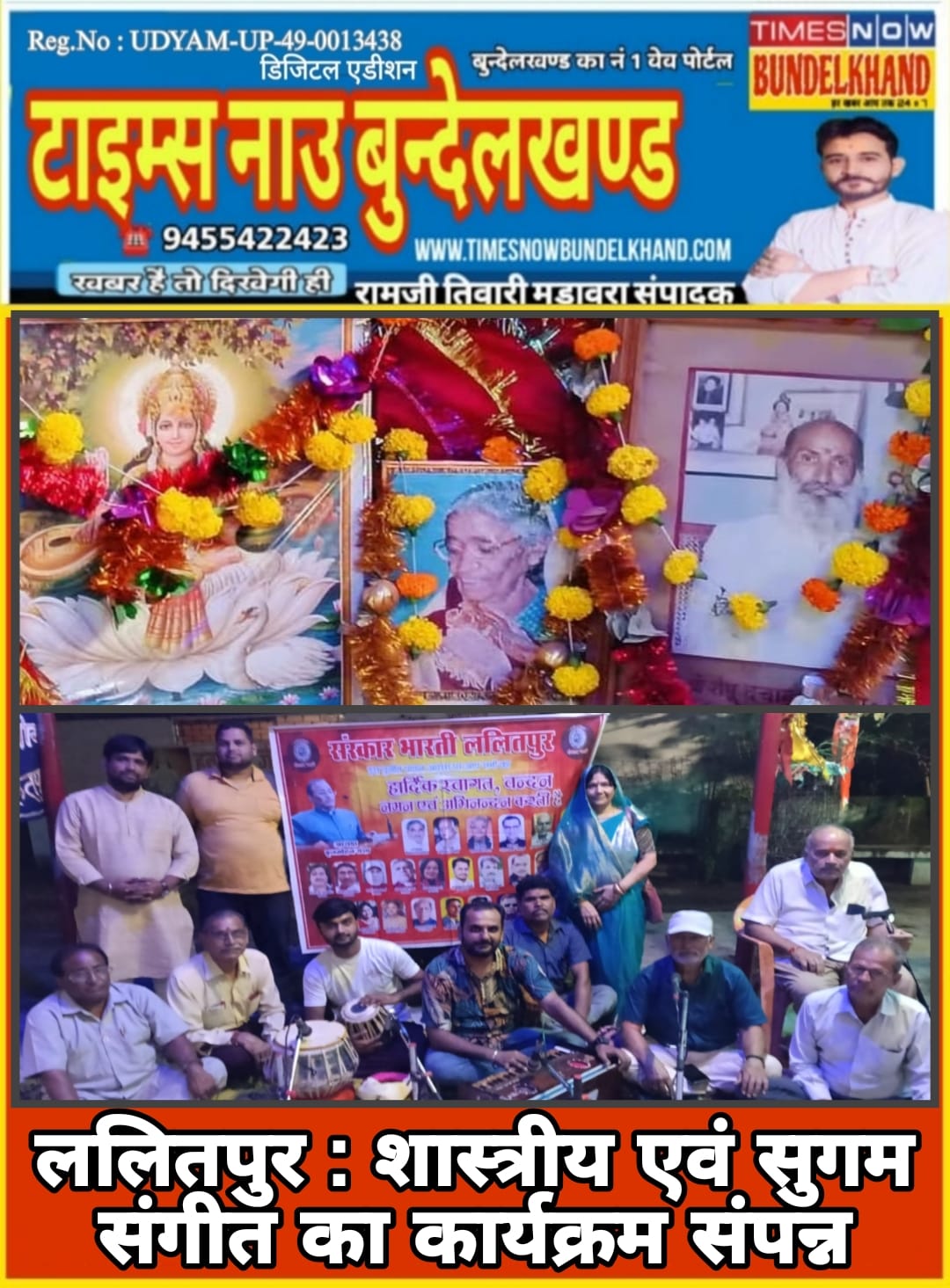 ललितपुर : कीर्ति शेष पंडित शंभू दयाल संज्ञा संगीतज्ञ की पुण्य स्मृति , पर संस्कार भारती ललितपुर इकाई एवं लायंस क्लब ललितपुर बुंदेलखंड यूनाइटेड के संयुक्त तत्वावधान में 19 सितंबर 2025 को शास्त्रीय एवं सुगम संगीत का कार्यक्रम संपन्न हुआ।