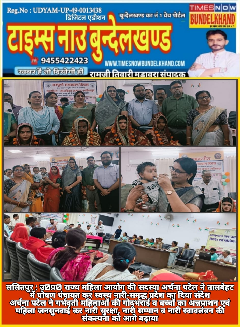 *उ0प्र0 राज्य महिला आयोग की सदस्या अर्चना पटेल ने तालबेहट में पोषण पंचायत कर स्वस्थ नारी-समृद्ध प्रदेश का दिया संदेश* *अर्चना पटेल ने गर्भवती महिलाओं की गोदभराई व बच्चों का अन्नप्राशन एवं महिला जनसुनवाई कर नारी सुरक्षा, नारी सम्मान व नारी स्वावलंबन की संकल्पना को आगे बढ़ाया*