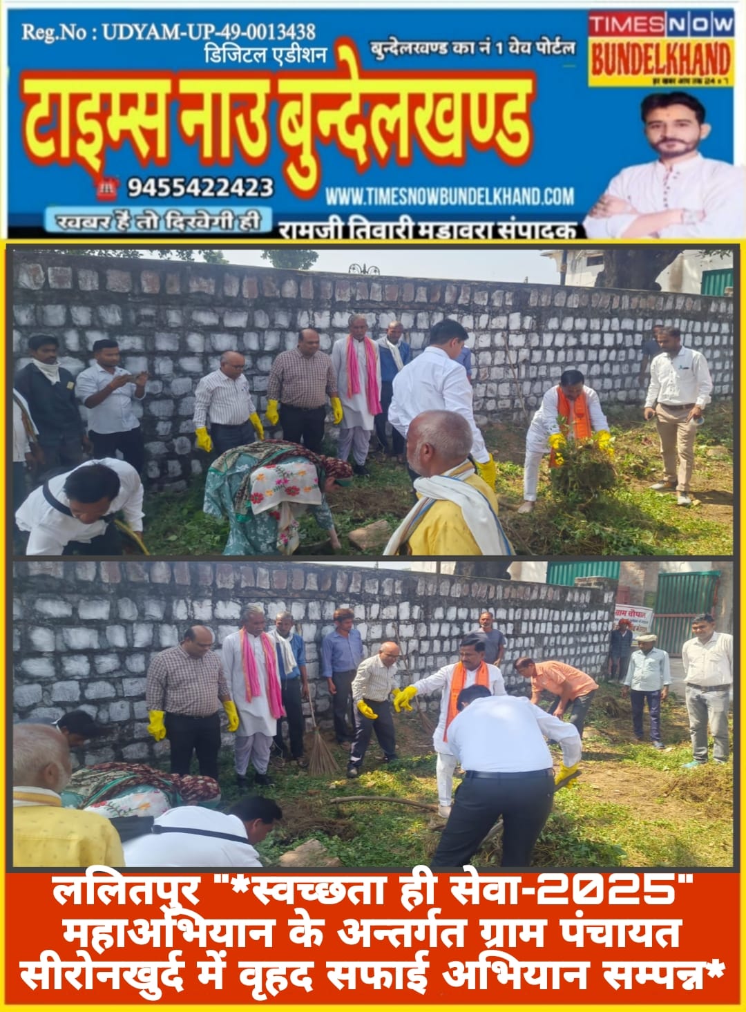ललितपुर : “स्वच्छता ही सेवा – 2025” महाअभियान के अन्तर्गत ललितपुर जनपद के विकास खण्ड जखौरा की ग्राम पंचायत सीरोनखुर्द में वृहद सफाई अभियान का आयोजन किया गया। इस कार्यक्रम का नेतृत्व मा. विधायक सदर श्री रामरतन कुशवाहा द्वारा किया गया।