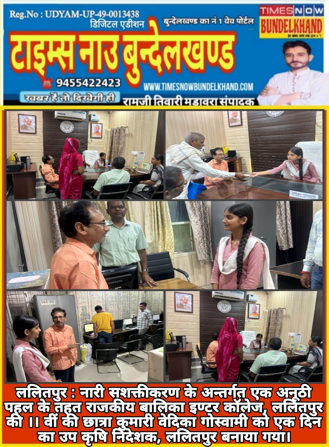 *नारी सशक्तीकरण के अन्तर्गत एक अनूठी पहल के तहत राजकीय बालिका इण्टर कॉलेज, ललितपुर की ।। वीं की छात्रा कुमारी वेदिका गोस्वामी को एक दिन का उप कृषि निदेशक, ललितपुर बनाया गया।*