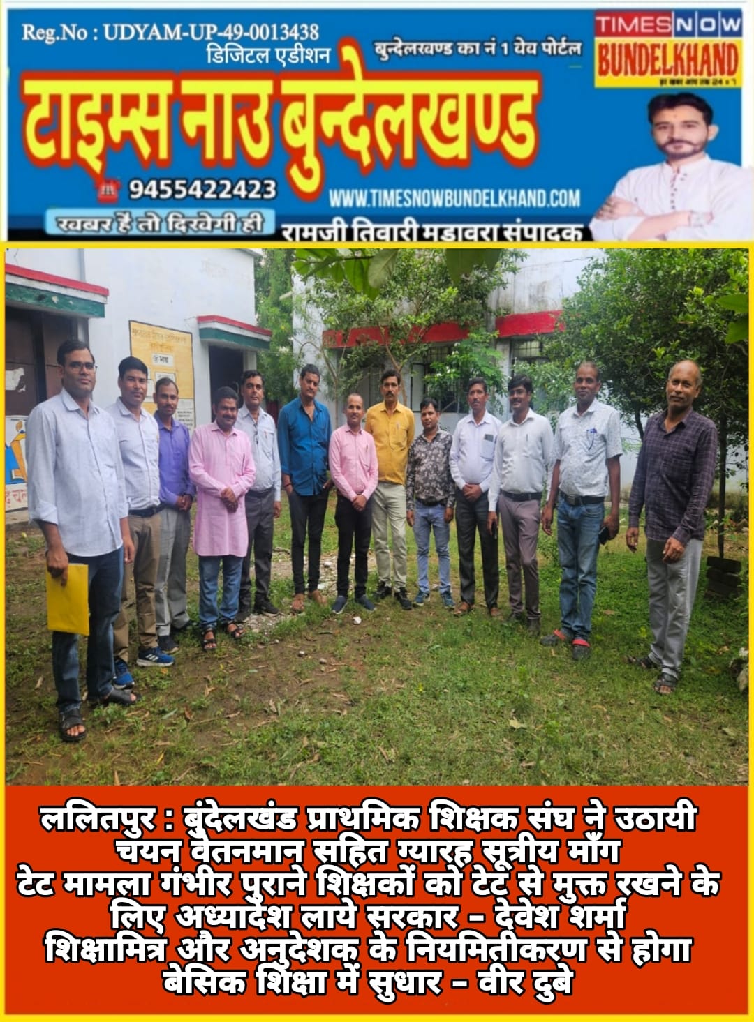 बुंदेलखंड प्राथमिक शिक्षक संघ ने उठायी चयन वेतनमान सहित ग्यारह सूत्रीय माँग। टेट मामला गंभीर पुराने शिक्षकों को टेट से मुक्त रखने के लिए अध्यादेश लाये सरकार – देवेश शर्मा। शिक्षामित्र और अनुदेशक के नियमितीकरण से होगा बेसिक शिक्षा में सुधार – वीर दुबे।