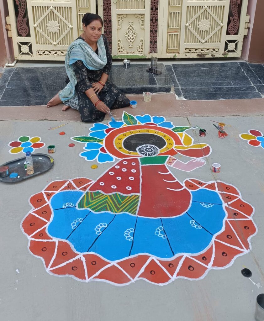 घर के द्वार पर बनाई आकर्षक रंगोली