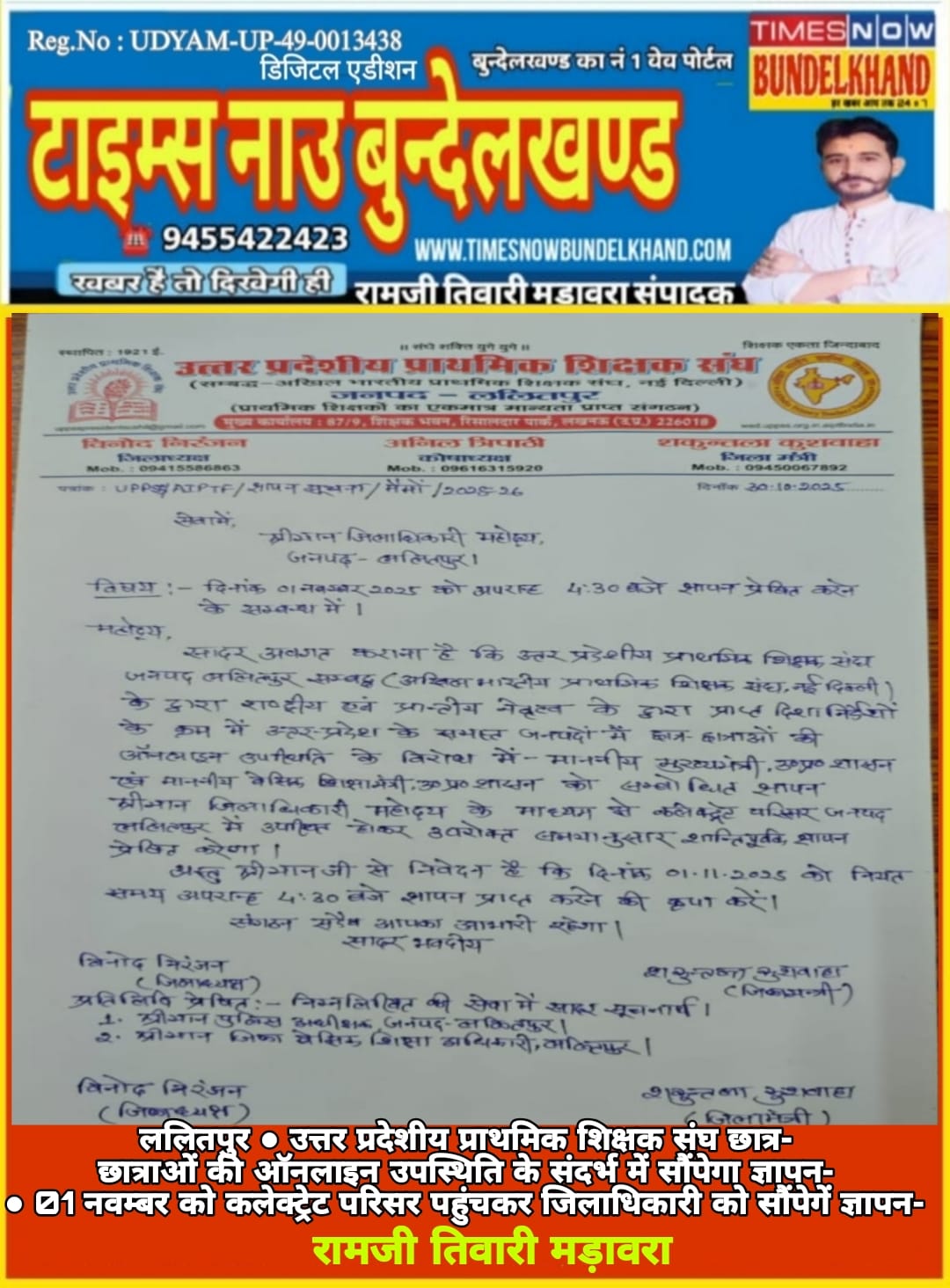 (ललितपुर)उत्तर प्रदेशीय प्राथमिक शिक्षक संघ जनपद ललितपुर (संबंद्ध- अखिल भारतीय प्राथमिक शिक्षक संघ,नई दिल्ली) के जिलाध्यक्ष विनोद निरंजन के नेतृत्व में राष्ट्रीय एवं प्रांतीय नेतृत्व के आह्वान एवं दिशा- निर्देशों के क्रम में उत्तर प्रदेश के समस्त जनपदों में छात्र-छात्राओं की ऑनलाइन उपस्थिति के विरोध में माननीय मुख्यमंत्री उत्तर प्रदेश शासन एवं माननीय बेसिक शिक्षा मंत्री उत्तर प्रदेश शासन को संबोधित ज्ञापन जिलाधिकारी महोदय के माध्यम से कलेक्ट्रेट परिसर ललितपुर में सायं 4:30 बजे सौंपा जायेगा। जिलाध्यक्ष ने शिक्षक-शिक्षिकाओं से आह्वान किया कि अधिक से अधिक संख्या में पहुंचकर ज्ञापन में सम्मिलित हों।
