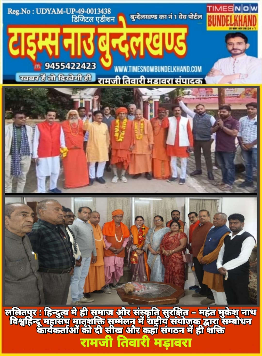 नगर के गांधीनगर के मां शारदा मिलन पैलेस में आयोजित मातृशक्ति को सम्बोधित करते हुए राष्ट्रीय संयोजक मुकेश नाथ महाराज ने कार्यकर्ताओं को संगठन की सीख दी। सम्मेलन में मातृशक्ति जिलाध्यक्ष रितू समाधिया, आशा कौशिक, प्रियंका राजपूत, अनीता मोदी,चेष्ठा श्रीवास्तव, कमलेश राठौर,मंजू तिवारी, हेमन्त गोस्वामी ने महंत जी का ललितपुर आगमन पर अभिनंदन कर आर्शीवाद ग्रहण किया। कार्यक्रम की अध्यक्षता योगी दिलीपनाथ ने करते हुए कहा विश्वहिन्दू महासंघ ने हिन्दुत्त्व को संगठित करने में कार्य किया वह सदैव स्मरणीय रहेगा इस कार्य में गौरक्ष पीठाधीश्वर महंत योगी आदित्यनाथ महाराज और उनके उनकी गुरूपरम्परा ने अकथनीय योगदान दिया।