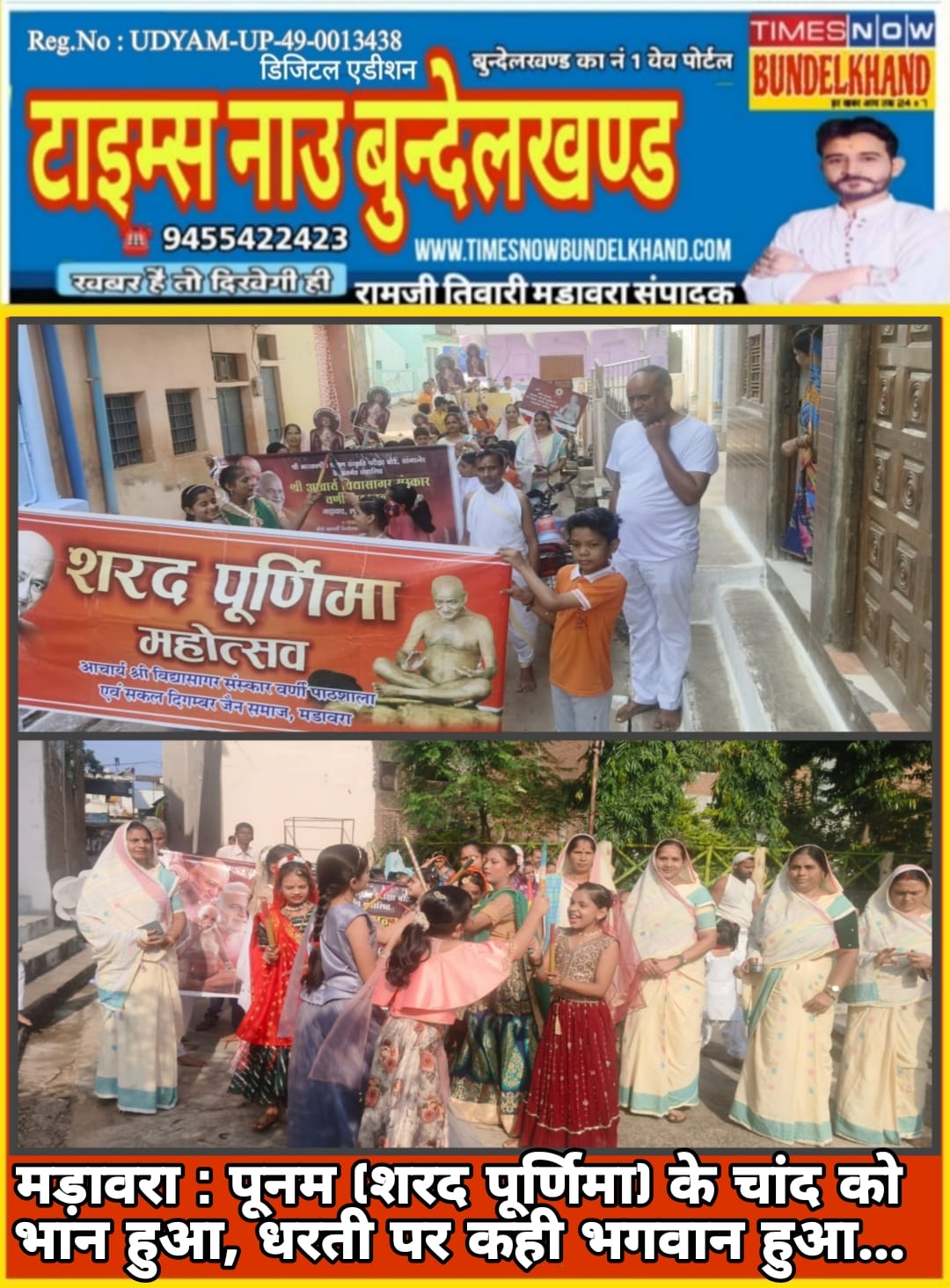 *मड़ावरा में जैन समाज द्वारा शरद पूर्णिमा को भव्यति भव्य रूप में मनाया गया, इसी पावन दिवस को धरती के भगवान, जैन धर्म के सबसे बड़े दिगंबराचार्य श्री विद्यासागर जी महामुनिराज का 1946 को कर्नाटक के सदलगा जिला बेलगांव में श्रीमंती और श्री मलप्पा जी अष्टगे के यहां विद्याधर के रूप में जन्म हुआ जो बाद में आचार्य विद्यासागर जी बने और इस शरद पूर्णिमा के चांद से सोने पे सुहागा तब किया जब उन्हीं माता पिता के घर इसी शरद पूर्णिमा को एक और बालक का जन्म शांतिनाथ के रूप ने 1958 को हुआ और बाद में वह आचार्य श्री विद्यासागर जी के पद के मूल उत्तराधिकारी के रूप में वर्तमान के सबसे बड़े श्रमणकुल के आचार्य पद पर सुशोभित हुए, एक ही दिन अलग अलग बर्ष में दोनों आचार्य का जन्म एक ही मां की कोख से होना किसी चमत्कार के कम नहीं, आचार्य श्री जन्म के समय इनकी माता को तीन शुभ स्वप्न दिखाई दिए जिनके शुभ फल का ही परिणाम है कि दोनों ही बालक ने संयम पथ अंगीकार किया, वैसे तो इनके चार भाई थे, जो संयम पथ पर चल रहे है और माता पिता ने भी जैनेश्वरी दीक्षा ग्रहण की, दोनों बहनें भी संयम मार्ग पर चल रही है, यूं कहे कि जैन धर्म के प्रथम तीर्थंकर आदिनाथ भगवान के बाद जैन संस्कृति में एक मात्र सड़लगा कर्नाटक के अष्टगे परिवार ही है जिनका पूरा घर संयम मार्ग पर चल रहा है, इस पावन शरद पूर्णिमा दिवस के अवसर पर सकल दिगंबर जैन समाज मड़ावरा ने विशाल जलूस के साथ शोभायात्रा निकाली एवं आचार्य श्री विद्यासागर वर्णी पाठशाला के बच्चों ने प्रभात फेरी निकाली..!