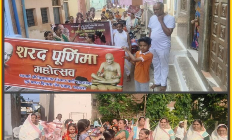 *मड़ावरा में जैन समाज द्वारा शरद पूर्णिमा को भव्यति भव्य रूप में मनाया गया, इसी पावन दिवस को धरती के भगवान, जैन धर्म के सबसे बड़े दिगंबराचार्य श्री विद्यासागर जी महामुनिराज का 1946 को कर्नाटक के सदलगा जिला बेलगांव में श्रीमंती और श्री मलप्पा जी अष्टगे के यहां विद्याधर के रूप में जन्म हुआ जो बाद में आचार्य विद्यासागर जी बने और इस शरद पूर्णिमा के चांद से सोने पे सुहागा तब किया जब उन्हीं माता पिता के घर इसी शरद पूर्णिमा को एक और बालक का जन्म शांतिनाथ के रूप ने 1958 को हुआ और बाद में वह आचार्य श्री विद्यासागर जी के पद के मूल उत्तराधिकारी के रूप में वर्तमान के सबसे बड़े श्रमणकुल के आचार्य पद पर सुशोभित हुए, एक ही दिन अलग अलग बर्ष में दोनों आचार्य का जन्म एक ही मां की कोख से होना किसी चमत्कार के कम नहीं, आचार्य श्री जन्म के समय इनकी माता को तीन शुभ स्वप्न दिखाई दिए जिनके शुभ फल का ही परिणाम है कि दोनों ही बालक ने संयम पथ अंगीकार किया, वैसे तो इनके चार भाई थे, जो संयम पथ पर चल रहे है और माता पिता ने भी जैनेश्वरी दीक्षा ग्रहण की, दोनों बहनें भी संयम मार्ग पर चल रही है, यूं कहे कि जैन धर्म के प्रथम तीर्थंकर आदिनाथ भगवान के बाद जैन संस्कृति में एक मात्र सड़लगा कर्नाटक के अष्टगे परिवार ही है जिनका पूरा घर संयम मार्ग पर चल रहा है, इस पावन शरद पूर्णिमा दिवस के अवसर पर सकल दिगंबर जैन समाज मड़ावरा ने विशाल जलूस के साथ शोभायात्रा निकाली एवं आचार्य श्री विद्यासागर वर्णी पाठशाला के बच्चों ने प्रभात फेरी निकाली..!