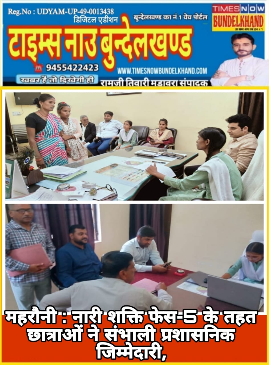 जिलाधिकारी के निर्देशानुसार नारी शक्ति फेस-5 अभियान के अंतर्गत महिलाओं के सम्मान और सशक्तिकरण को बढ़ावा देने के लिए तहसील महरौनी में विशेष कार्यक्रम आयोजित किया गया। इस अवसर पर राजकीय बालिका इंटर कॉलेज महरौनी की मेधावी छात्राओं को एक दिन के लिए प्रशासनिक जिम्मेदारी सौंपी गई।