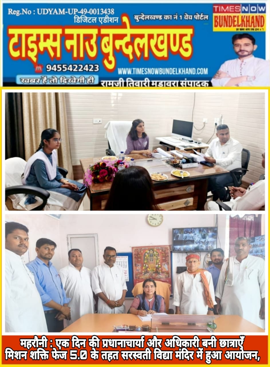 एक दिन की प्रधानाचार्या और अधिकारी बनी छात्राएँ मिशन शक्ति फेज 5.0 के तहत सरस्वती विद्या मंदिर में हुआ आयोजन,