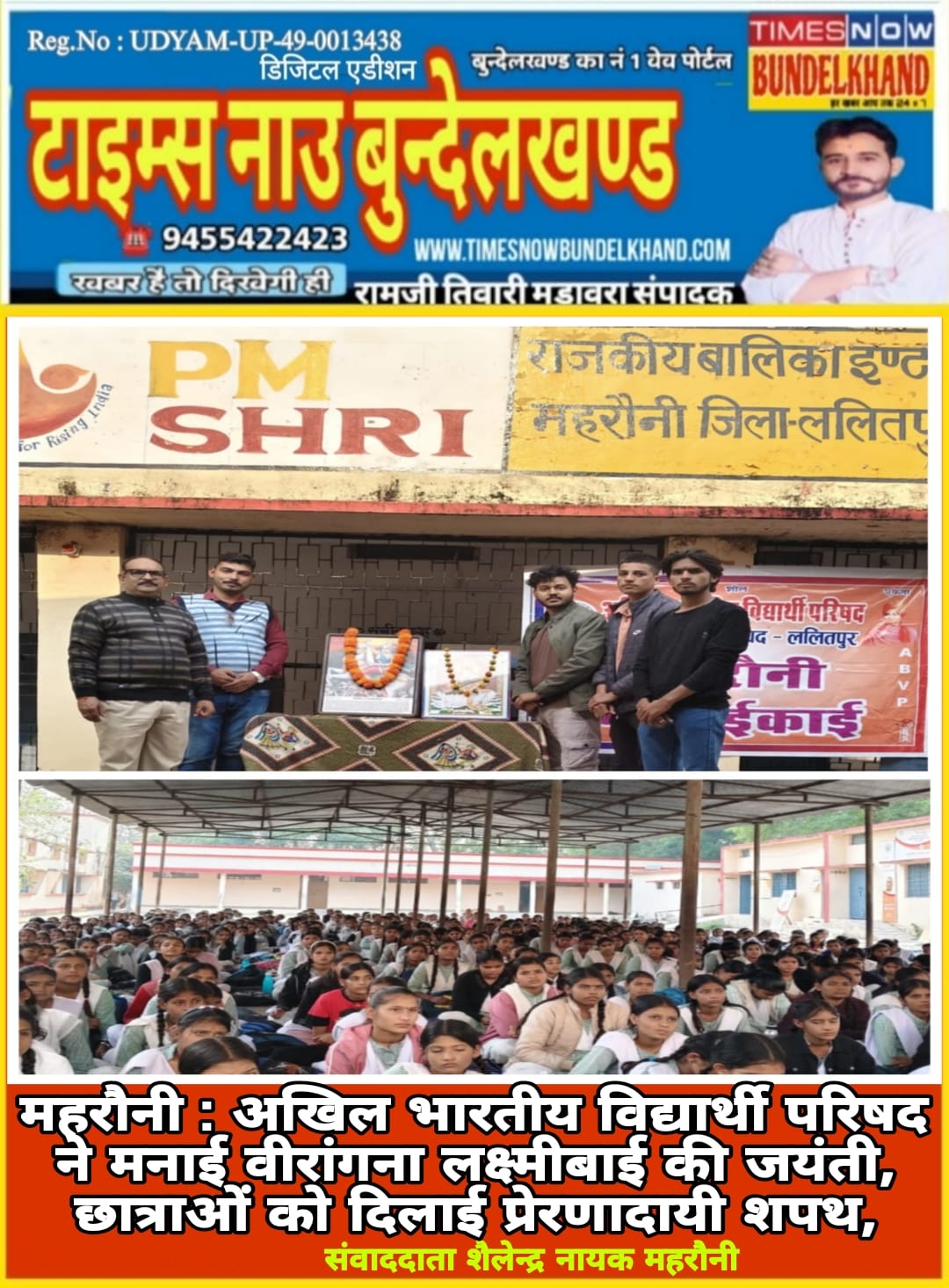 अखिल भारतीय विद्यार्थी परिषद की महरौनी नगर इकाई द्वारा राजकीय बालिका इंटर कॉलेज महरौनी में वीरांगना महारानी लक्ष्मीबाई की जयंती श्रद्धा और उत्साह के साथ मनाई गई। कार्यक्रम की शुरुआत में छात्राओं को रानी लक्ष्मीबाई के जीवन, उनके अदम्य साहस, संघर्ष और बलिदान की प्रेरणादायी गाथा से अवगत कराया गया। वक्ताओं ने कहा कि बुन्देलखण्ड की प्रत्येक बेटी में लक्ष्मीबाई जैसा जज़्बा, आत्मविश्वास और राष्ट्रभक्ति होनी चाहिए।