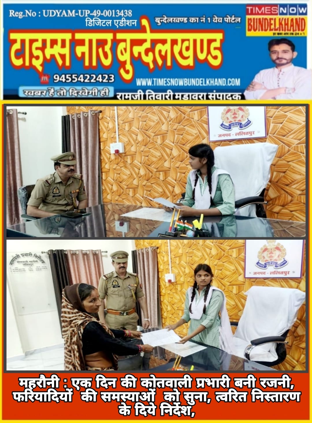 मिशन शक्ति अभियान के फेज-5 को गति देते हुये कोतवाली महरौनी में राजकीय बालिका इंटर कालेज महरौनी की छात्रा रजनी को एक दिन का प्रभारी निरीक्षक बनाया गया। इस दौरान उन्होंने फियादियों की समस्याओं को सुना और त्वरित समाधान का भरोसा दिलाया।
