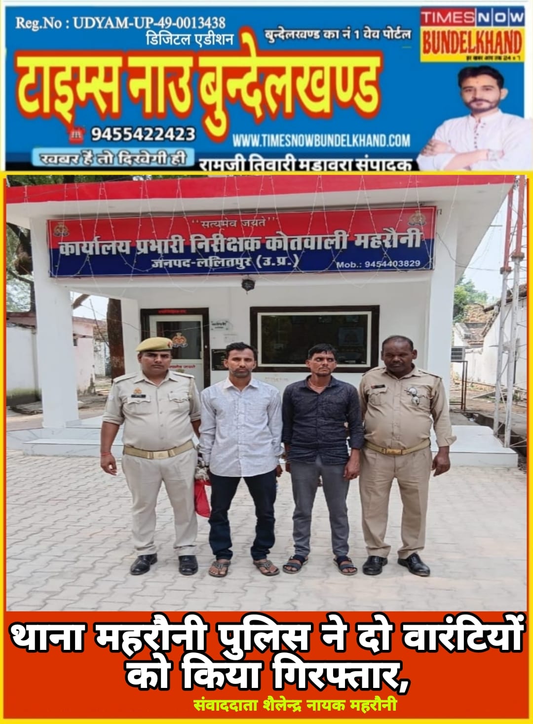 पुलिस अधीक्षक ललितपुर मो. मुश्ताक के निर्देशन, अपर पुलिस अधीक्षक कालू सिंह एवं क्षेत्राधिकारी महरौनी आशीष कुमार मिश्र के पर्यवेक्षण में चलाए जा रहे वांछित एवं वारंटी अभियुक्तों की गिरफ्तारी अभियान के तहत थाना महरौनी पुलिस ने दो वारंटियों को गिरफ्तार किया है।