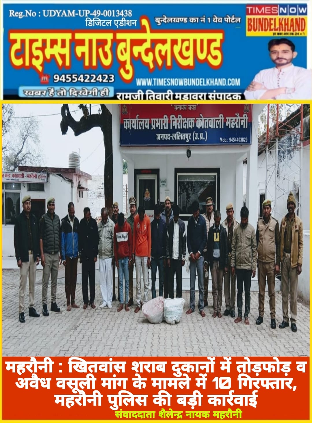 महरौनी कोतवाली क्षेत्र अंतर्गत ग्राम खितवांस में देशी शराब की दुकान व कम्पोजिट अंग्रेजी शराब की दुकान पर तोड़फोड़ करने तथा अवैध रुपयों की मांग करने के मामले में वांछित 10 अभियुक्तों को महरौनी पुलिस ने गिरफ्तार कर लिया है।