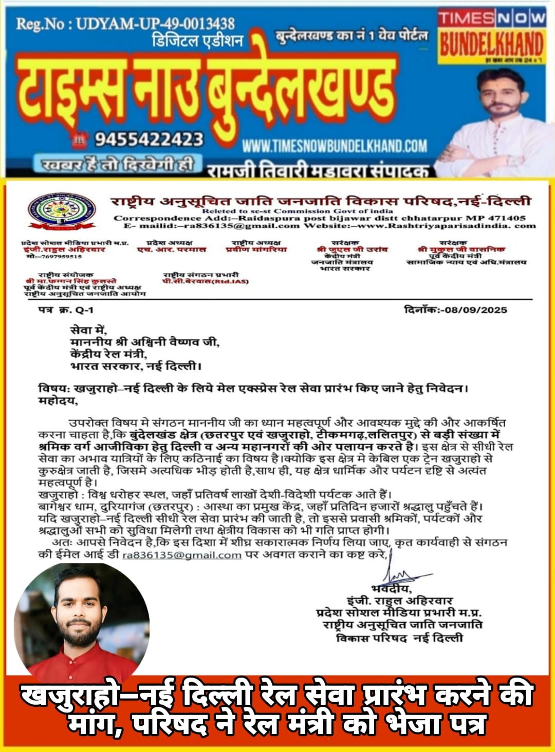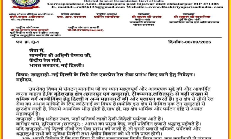 राष्ट्रीय अनुसूचित जाति जनजाति विकास परिषद, नई दिल्ली ने केंद्रीय रेल मंत्री माननीय अश्विनी वैष्णव को पत्र लिखकर खजुराहो–नई दिल्ली के बीच सीधी मेल/एक्सप्रेस रेल सेवा प्रारंभ करने की मांग की है।