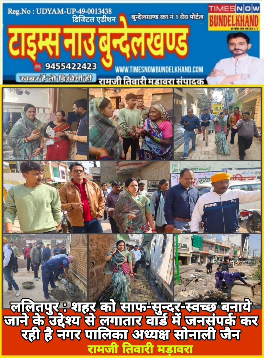 ललितपुर : शहर को साफ-सुन्दर-स्वच्छ बनाये जाने के उद्देश्य से नगर पालिका द्वारा चलाये जा रहे निरीक्षण अभियान के तहत आज दिनांक 15.11.2025 को मा० अध्यक्ष श्रीमती सोनाली जैन (अभिलाषा) द्वारा वार्ड पार्षद एड. श्री मनमोहन चौबे के साथ शहर के मोहल्ला गांधीनगर वार्ड नं0-15 का निरीक्षरण करते हुए साफ-सफाई व्यवस्था दुरूस्त किये जाने व सड़कों, नालियों एवं क्षतिग्रस्त चैम्बरों की मरम्मत कराये जाने के निर्देश दिये गये। वहीं अनेक समस्याओं का निस्तारण अध्यक्ष द्वारा मौके पर ही कराया गया, जहां-जहां नालियां चौक थी. उन सभी को सफाई कमियों के माध्यम से खुलवाते हुए निर्देशित किया गया, वहीं अध्यक्ष महोदया द्वारा किये जा रहे कार्यों की मोहल्लेवासियों द्वारा सराहना करते हुए उन्हें सम्मानित किया गया।