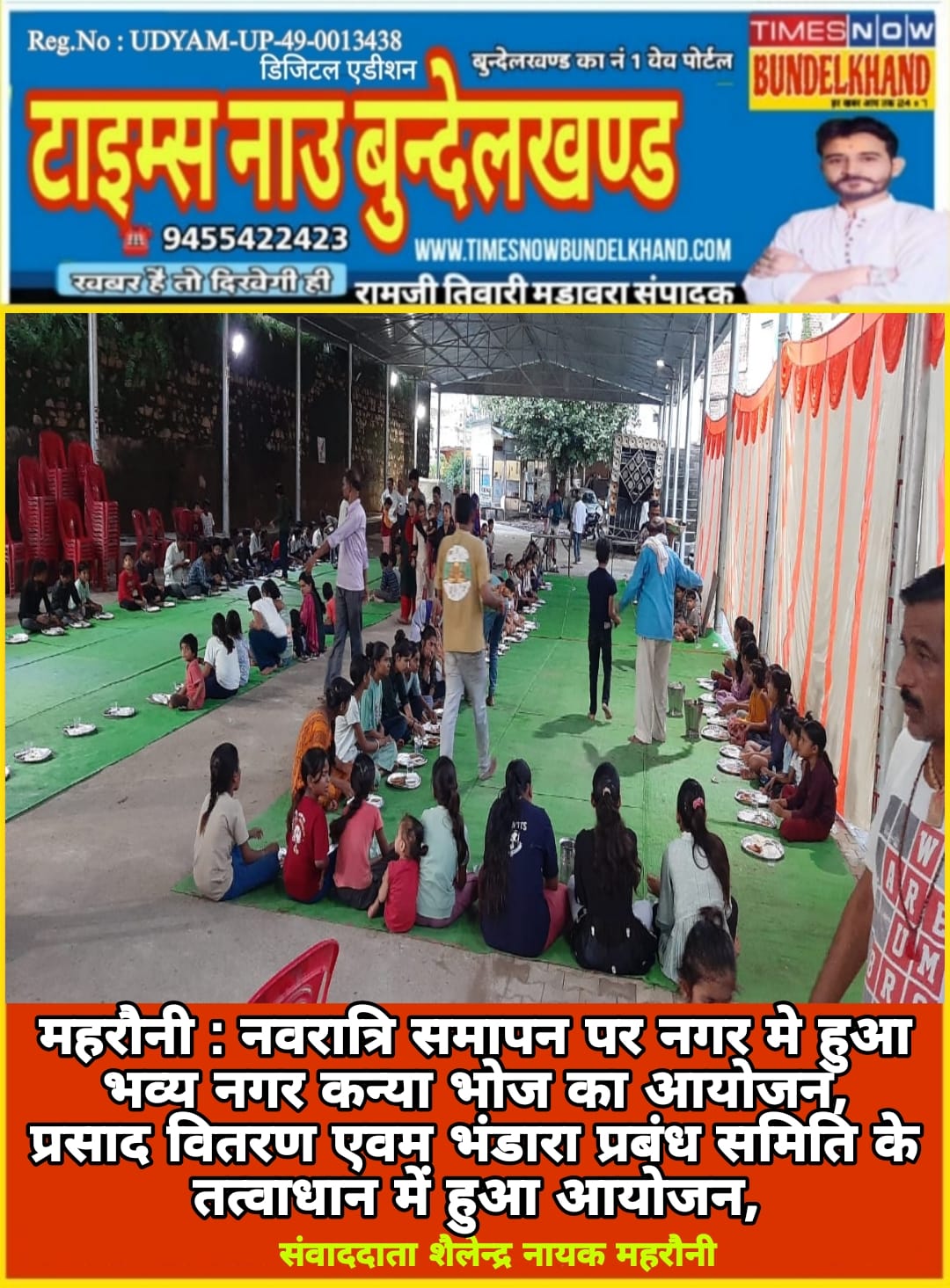 पावन नवरात्रि के समापन अवसर पर शनिवार को प्रसाद वितरण एवम भंडारा प्रबंध समिति महरौनी के तत्वाधान में भव्य नगर कन्या भोज का आयोजन नगर के सद्भावना मंच परिसर में किया गया।
