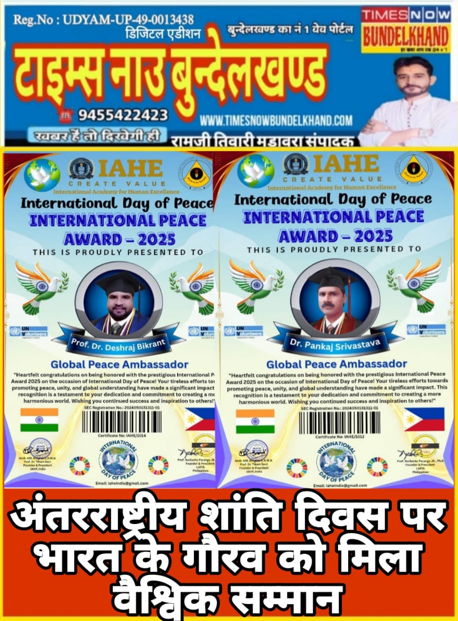 अंतरराष्ट्रीय शांति दिवस के अवसर पर इंटरनेशनल एकेडमी फॉर ह्यूमन एक्सीलेंस (IAHE), भारत एवं LAPIS, फिलीपींस के संयुक्त तत्वावधान में आयोजित कार्यक्रम में भारत के प्रख्यात शिक्षाविद् एवं समाजसेवी प्रो. डॉ. देशराज विक्रांत तथा डॉ. पंकज श्रीवास्तव को प्रतिष्ठित “इंटरनेशनल पीस अवार्ड – 2025” से सम्मानित किया गया।