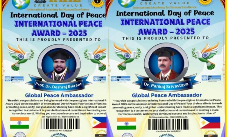 अंतरराष्ट्रीय शांति दिवस के अवसर पर इंटरनेशनल एकेडमी फॉर ह्यूमन एक्सीलेंस (IAHE), भारत एवं LAPIS, फिलीपींस के संयुक्त तत्वावधान में आयोजित कार्यक्रम में भारत के प्रख्यात शिक्षाविद् एवं समाजसेवी प्रो. डॉ. देशराज विक्रांत तथा डॉ. पंकज श्रीवास्तव को प्रतिष्ठित “इंटरनेशनल पीस अवार्ड – 2025” से सम्मानित किया गया।