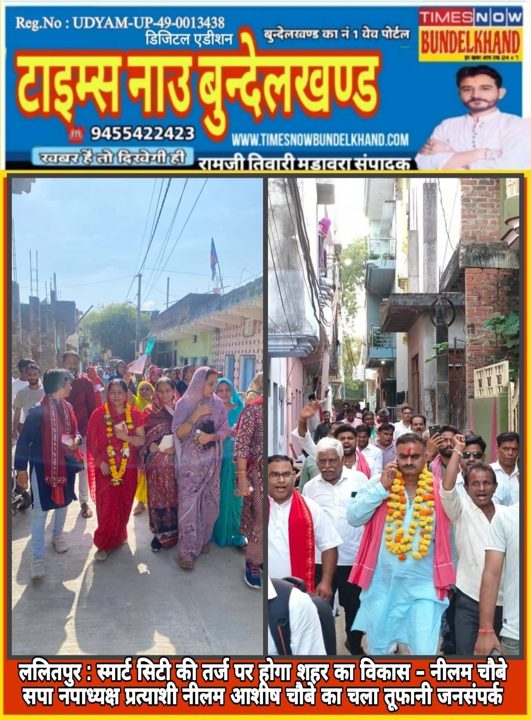 ललितपुर। समाजवादी पार्टी की नपाध्यक्ष पद प्रत्याशी श्रीमती नीलम आशीष चौबे का जनसंपर्क अभियान दिन-प्रतिदिन रफ्तार पकड़ता जा रहा है। शहर के विभिन्न वार्डों में घर-घर जाकर उन्होंने जनता से सीधा संवाद किया और साथ ही शहरवासियों ने उनका फूल माला पहनाकर स्वागत किया। जहां उन्होंने कहा कि ललितपुर शहर का स्मार्ट सिटी की तर्ज पर विकास किया जाएगा।