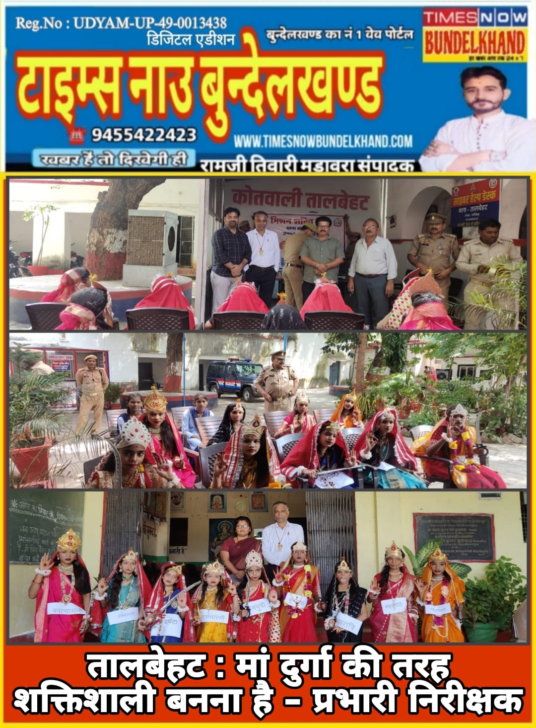 तालबेहट : तेरईफाटक ललितपुर स्थिति वीणा वादिनी बालिका इण्टर कॉलेज तेरईफाटक ललितपुर की छात्राओं द्वारा मिशन शक्ति कार्यक्रम के अन्तर्गत आज कोतवाली तालबेहट का भ्रमण कर विभिन्न प्रकार की जानकारी प्राप्त की । सभी छात्राये मां दुर्गा के अष्टरुप में कोतवाली पहुंची। प्रभारी निरीक्षक मनोज मिश्रा ने सभी अष्टभुजा माताओ का पूजन किया व कोतवाली में संचालित सभी प्रकार की जानकारी छात्राओं को प्रदान की।इस अवसर पर नगर पंचायत तालबेहट के अध्यक्ष पुनीत सिंह परिहार, व्यापार मण्डल के अध्यक्ष विजय सोनी, दैनिक जागरण के तहसील संवाददाता अखिलेश जैन,सुनील त्रिपाठी बाबा, राजेन्द्र गोस्वामी अध्यक्ष ग्रामीण पत्रकार एसोसिएशन तालबेहट , वीणा वादिनी बालिका इण्टर कॉलेज तेरईफाटक के प्रधानाचार्य मनोज कुमार तिवारी, स्काउट गाइड की प्रभारी श्रेया तिवारी उपस्थित रहीं।
